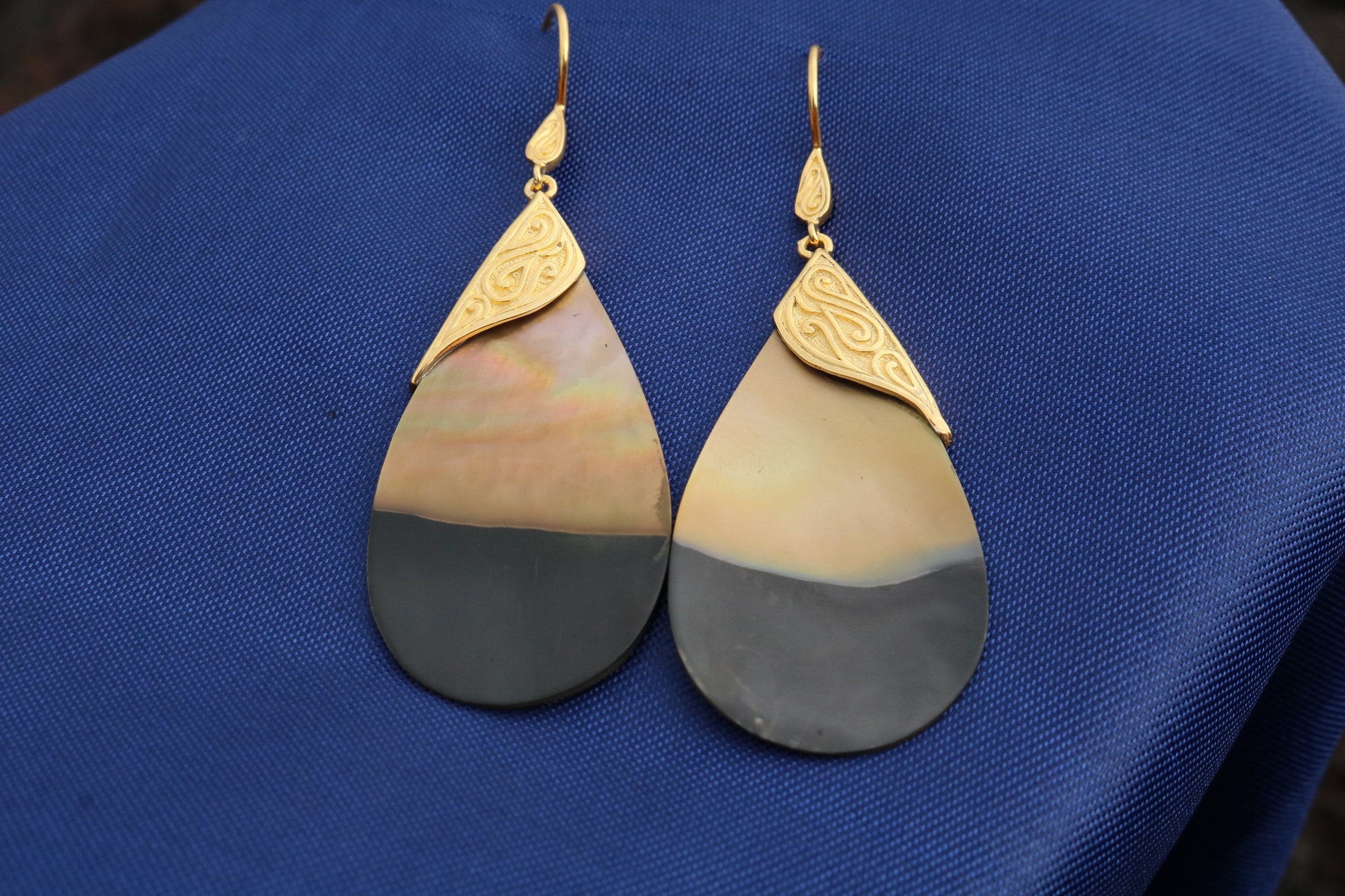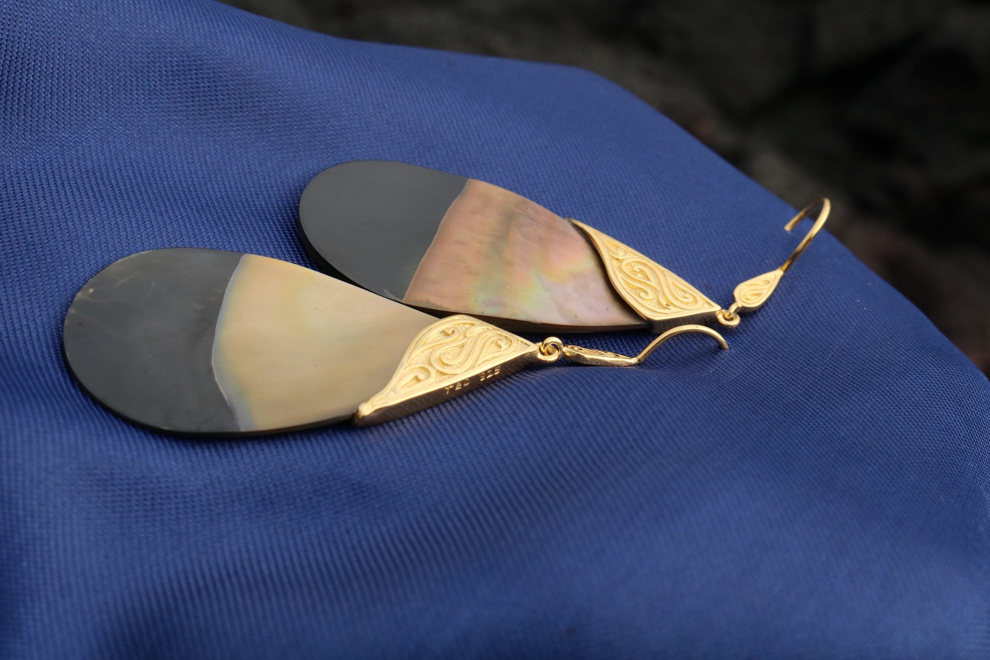 18k Gold Teardrop Black Oyster Shell Earrings Tribal Design. Sterling Silver.