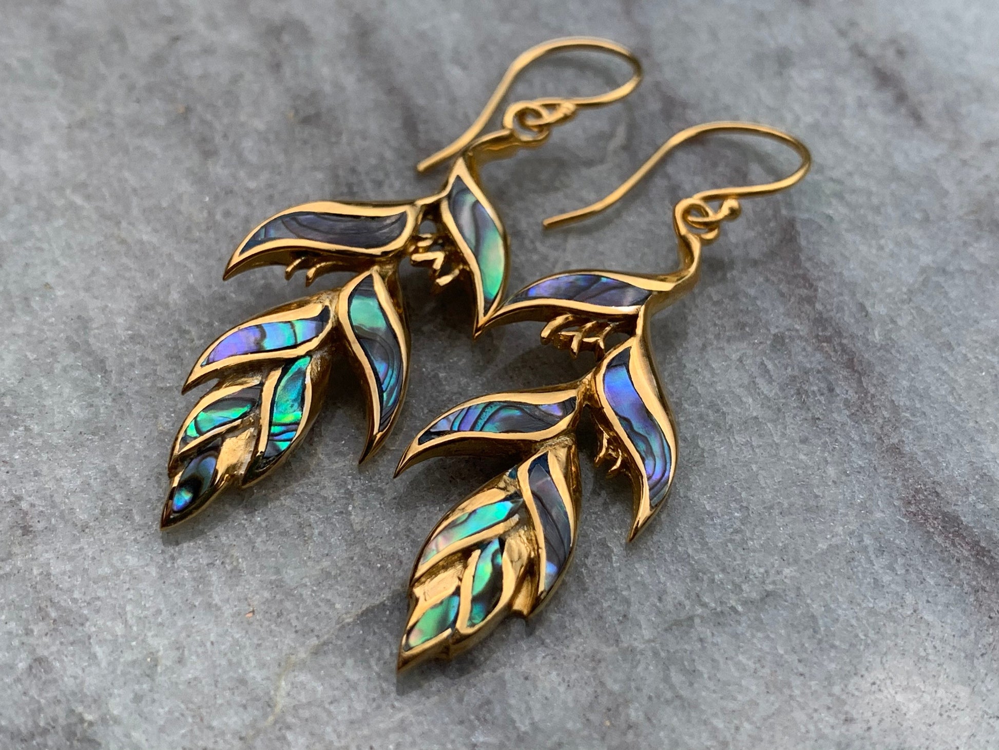 18K Gold Vermeil Heliconia Flower Earrings. Abalone Shell.