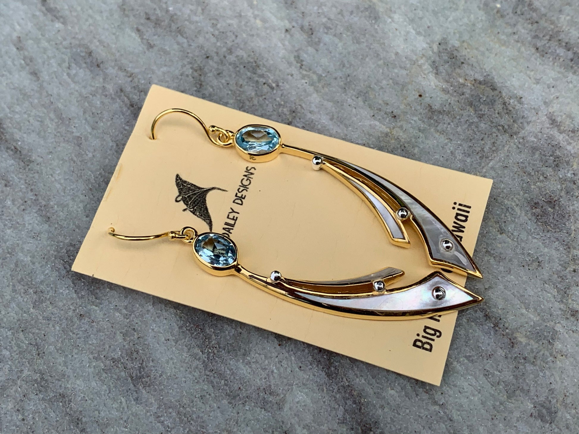 18k Gold Vermeil Wave Earrings. Blue Topaz, Mother of Pearl