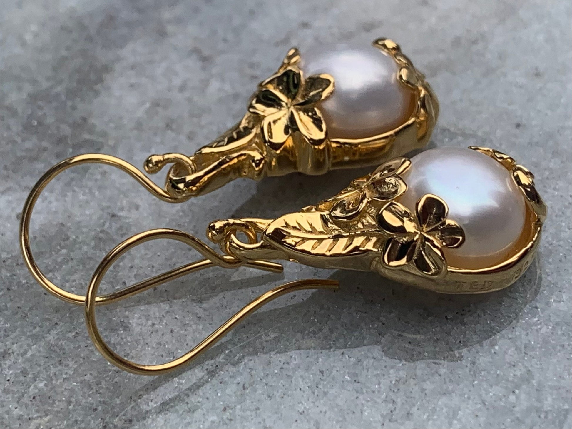 18k gold vermeil white mabe pearl plumeria flower earrings. Hawaiian Honu.