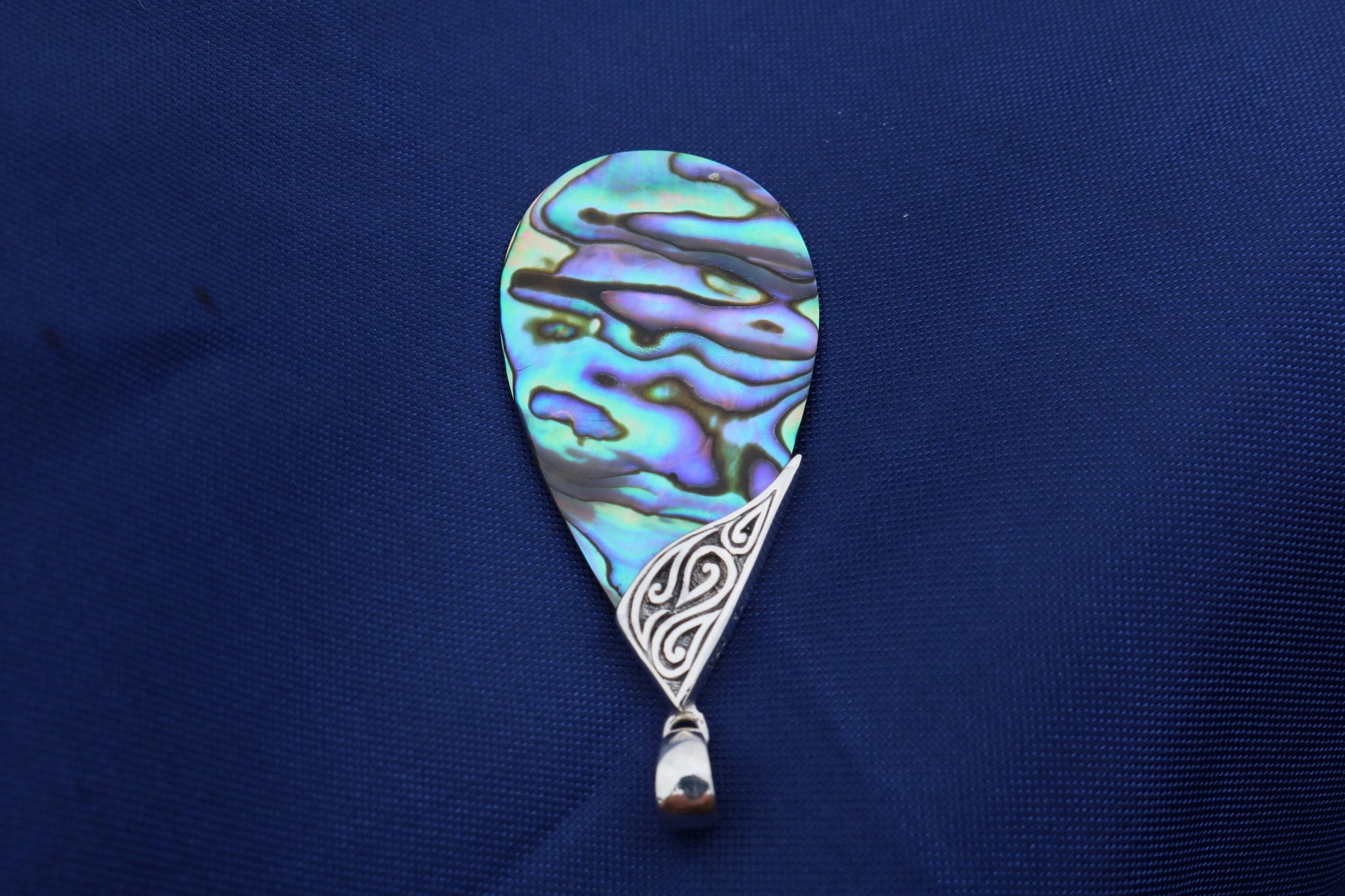 Abalone Paua Shell Teardrop Pendant Necklace. Sterling Silver.