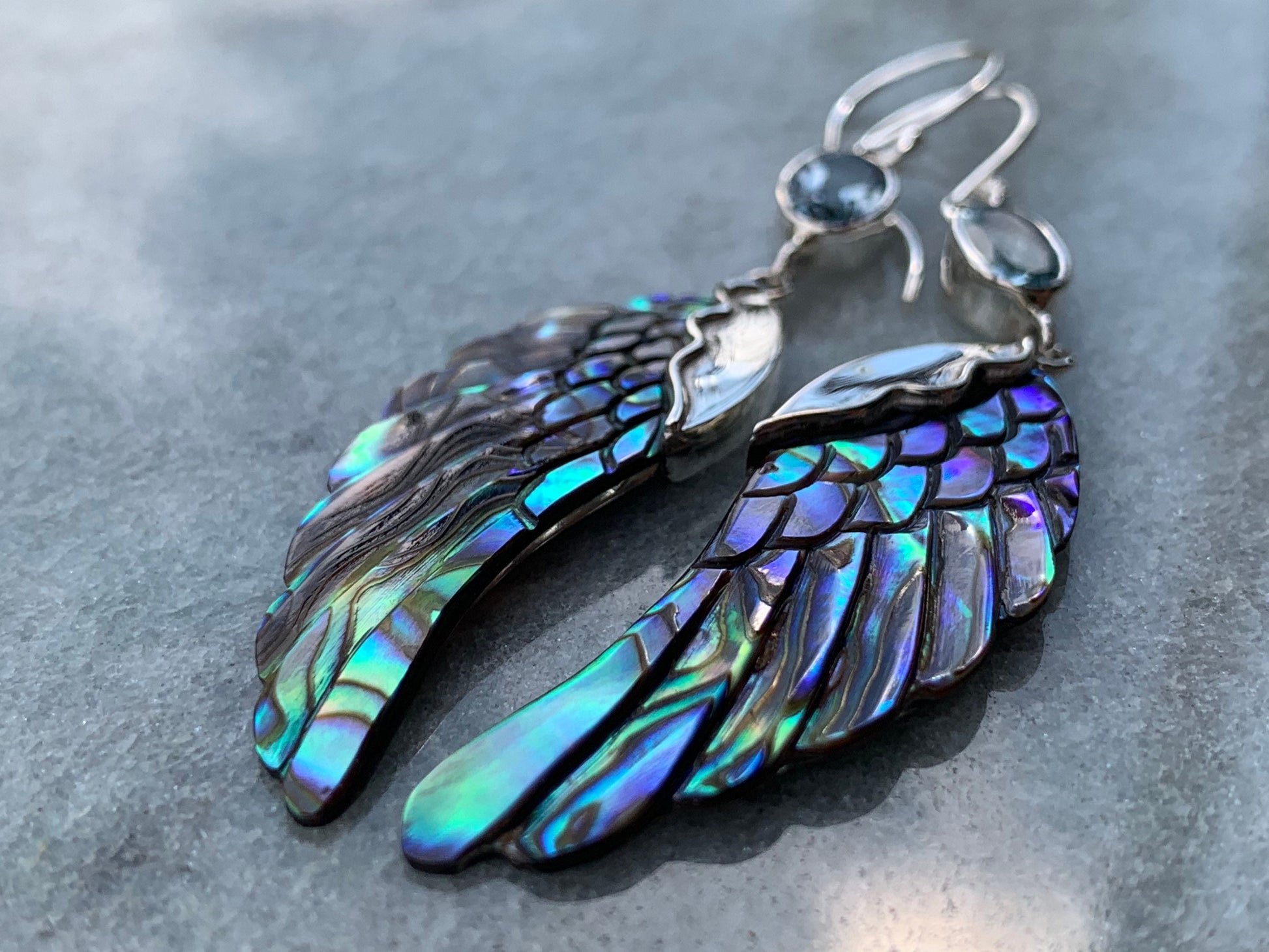 Angel Wings Earrings | Paua Abalone Shell | Sterling Silver | Blue Topaz | Gift | Jewelry | Handmade | Unique