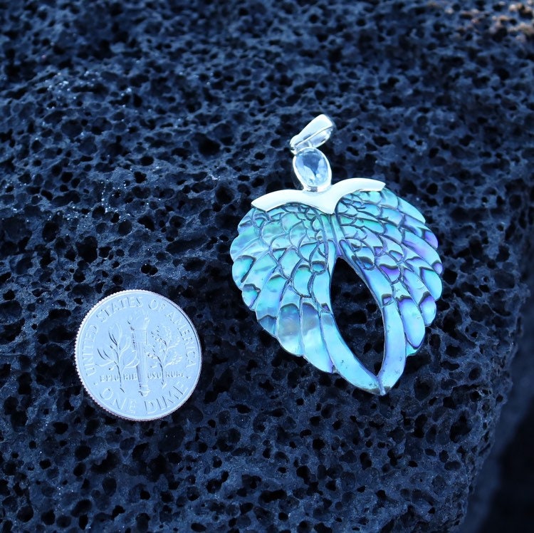 Angel Wings Heart Abalone (Paua) Shell Necklace Pendant with Blue Topaz. Sterling Silver.