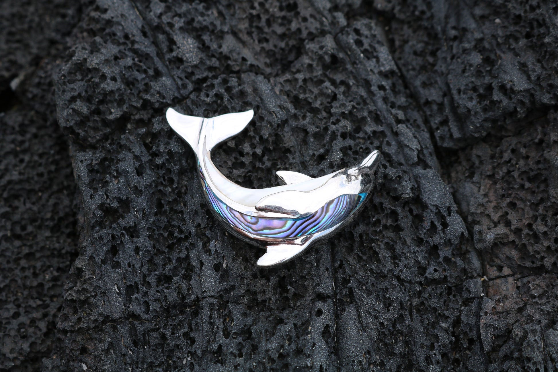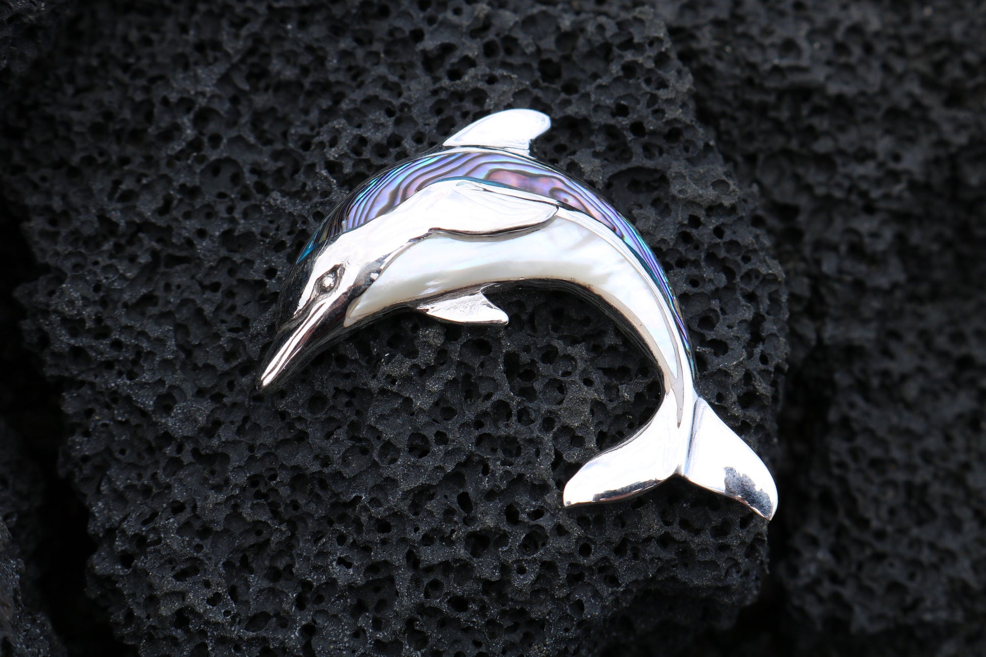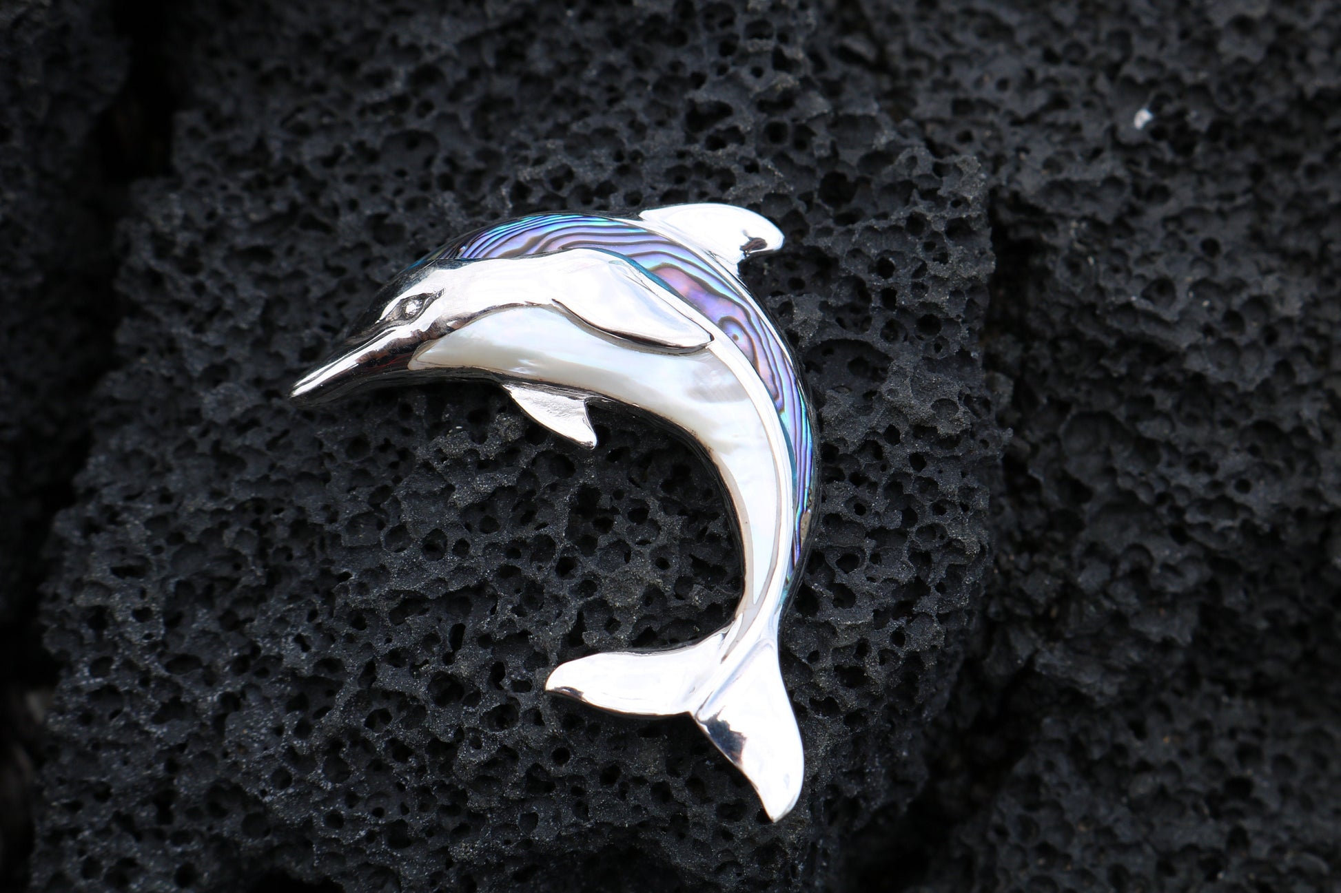 Aumakua Dolphin Necklace Pendant. Abalone Paua Shell, Mother of Pearl, Sterling Silver.