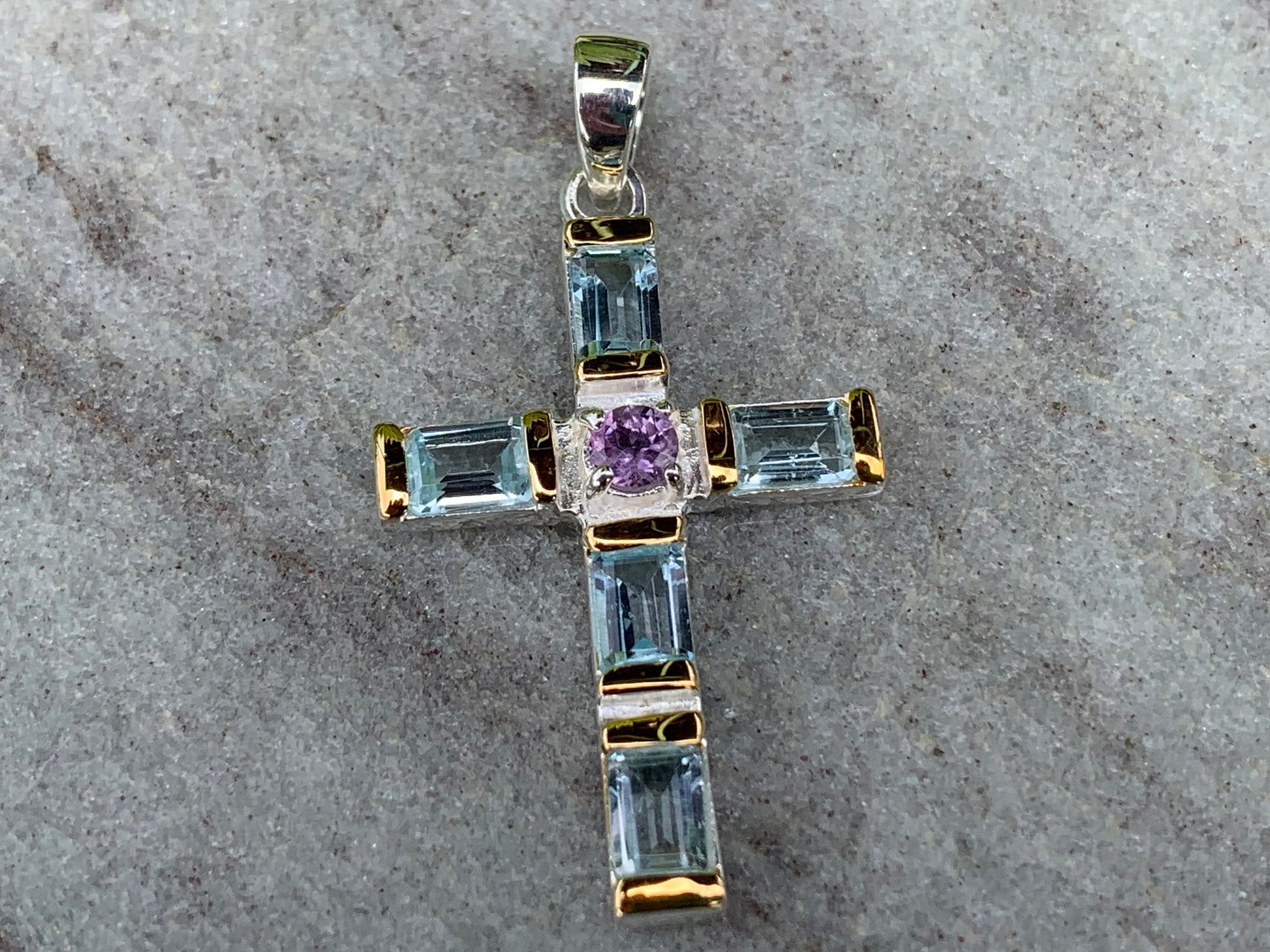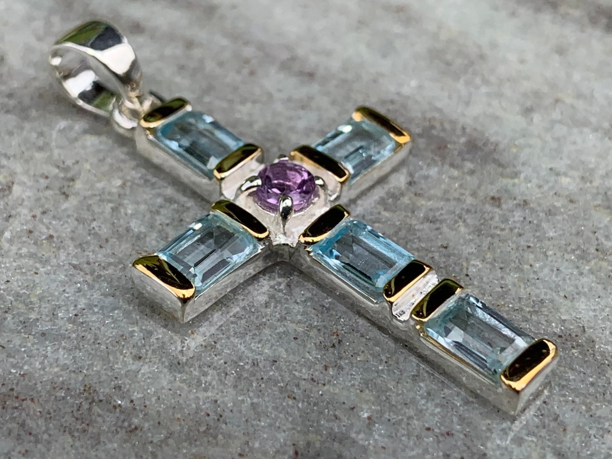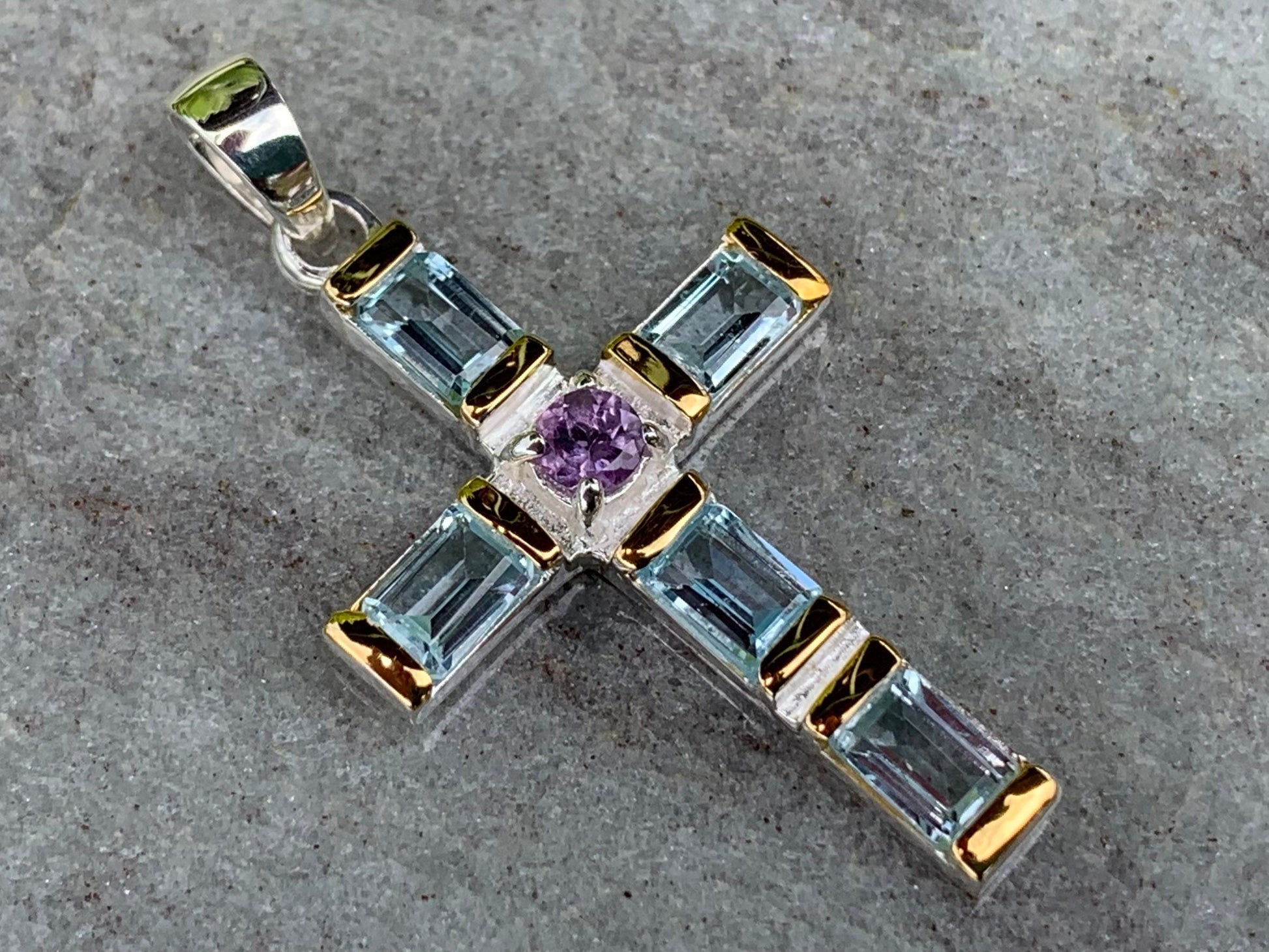 Cross Pendant Necklace. Blue topaz and Amethyst (in the middle). Sterling Silver, 18k gold.