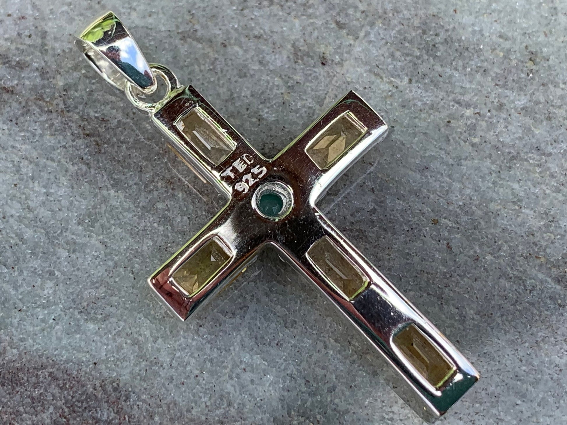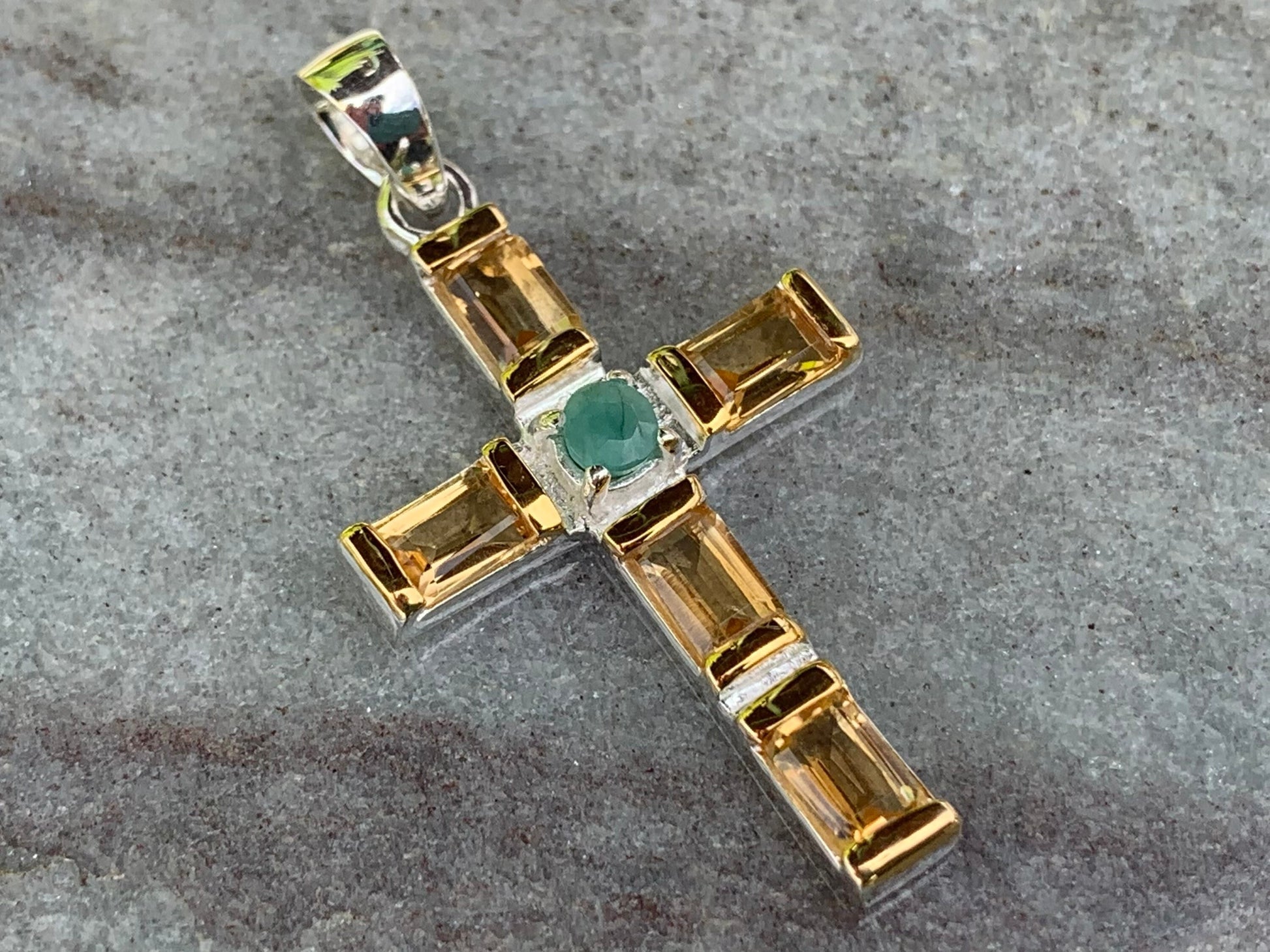 Cross Pendant Necklace. Citrines and Emerald (in the middle). Sterling Silver, 18k gold.