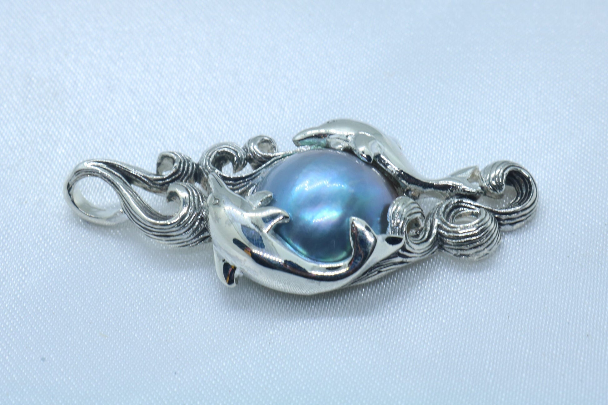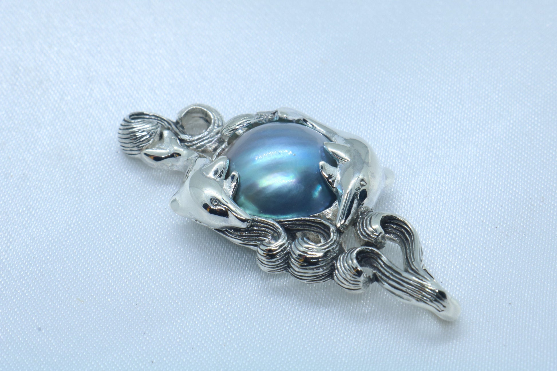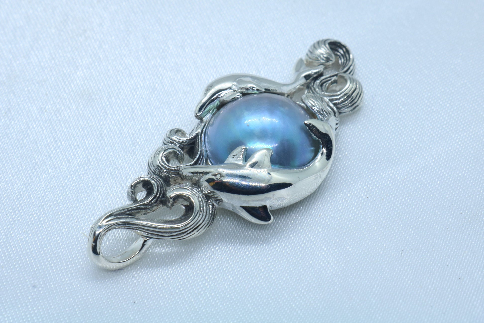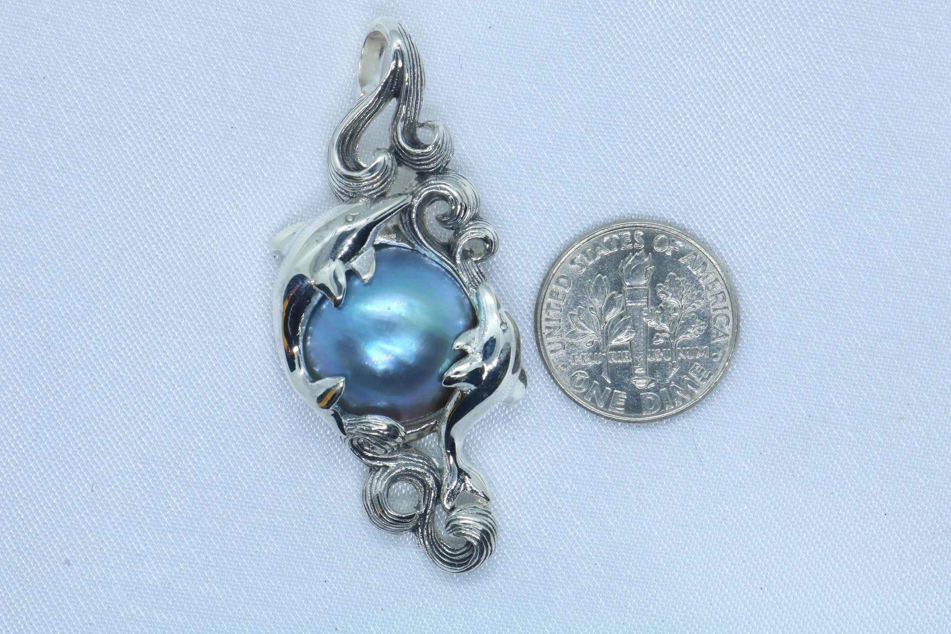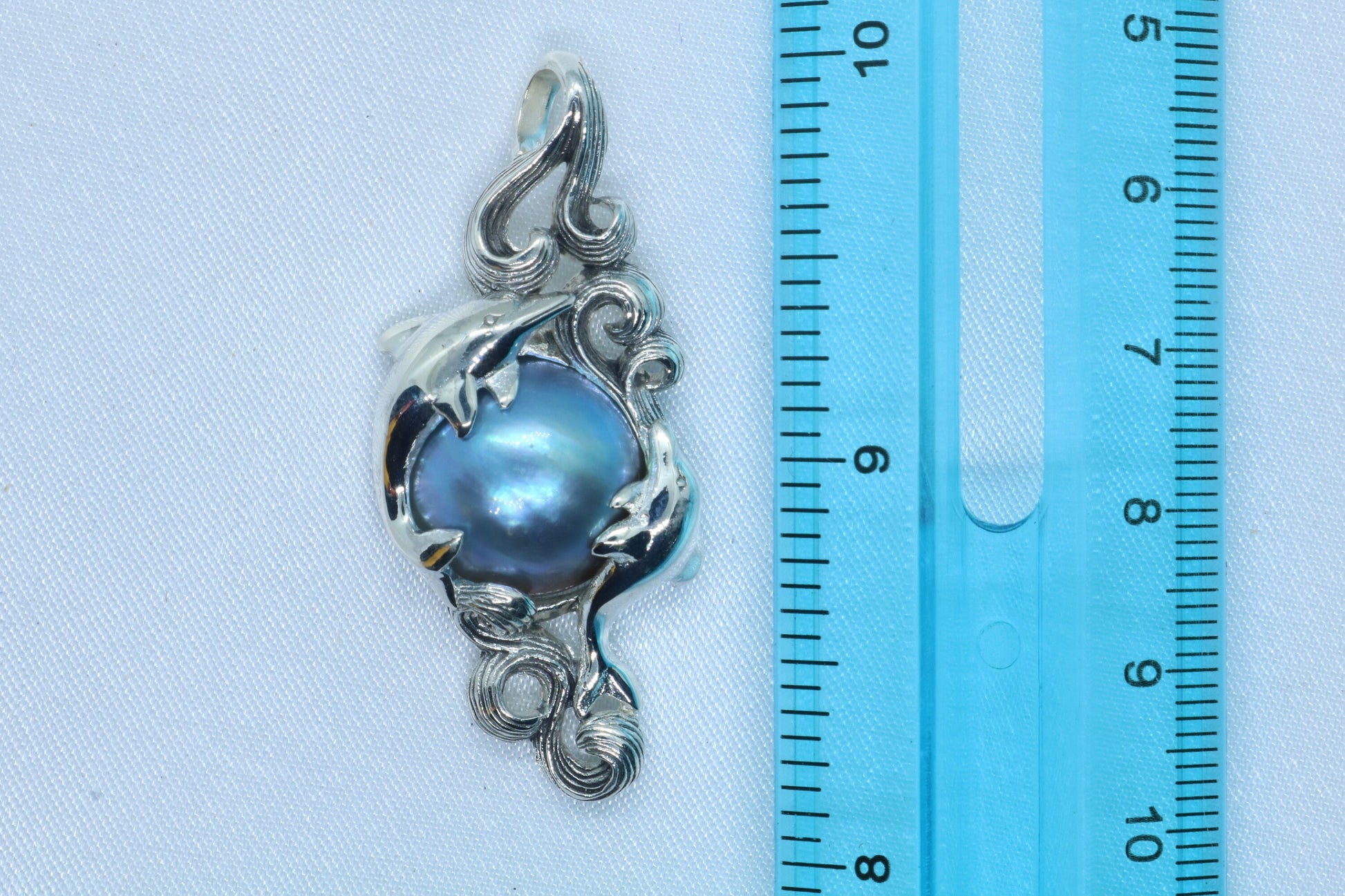 Dolphins Blue Mabe Pearl Silver Pendant Necklace