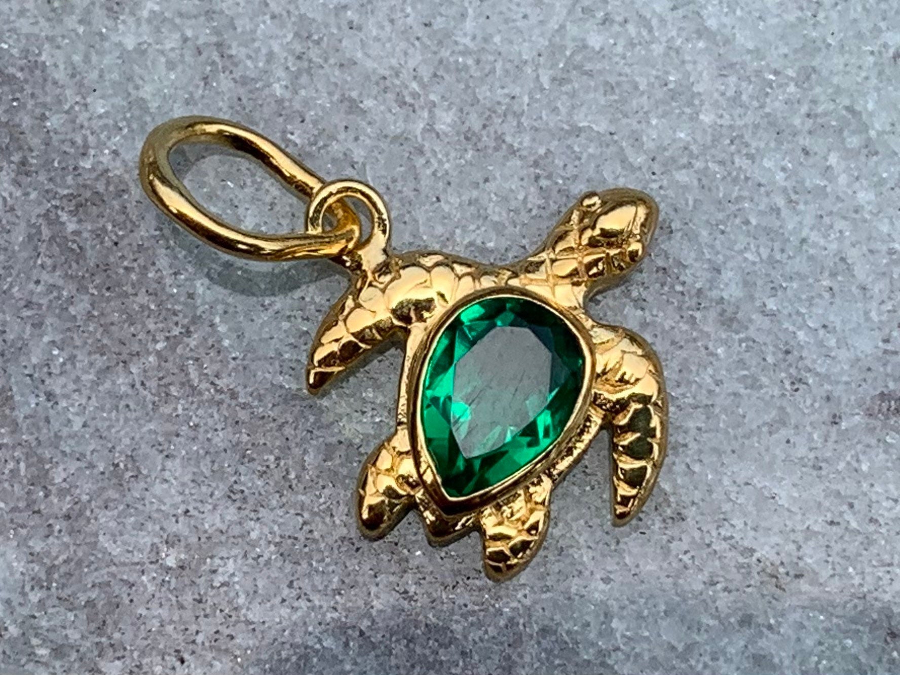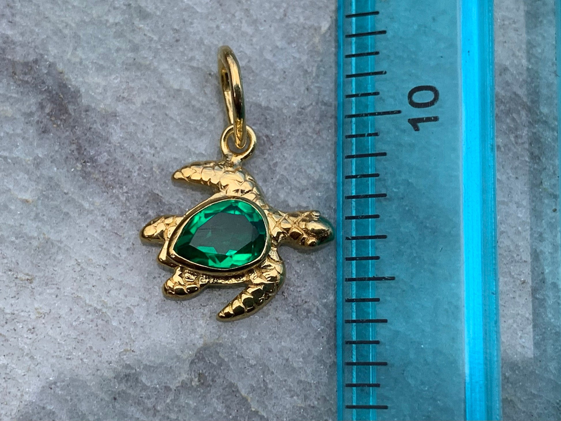 Emerald Turtle Charm Pendant Necklace. Gold Vermeil.