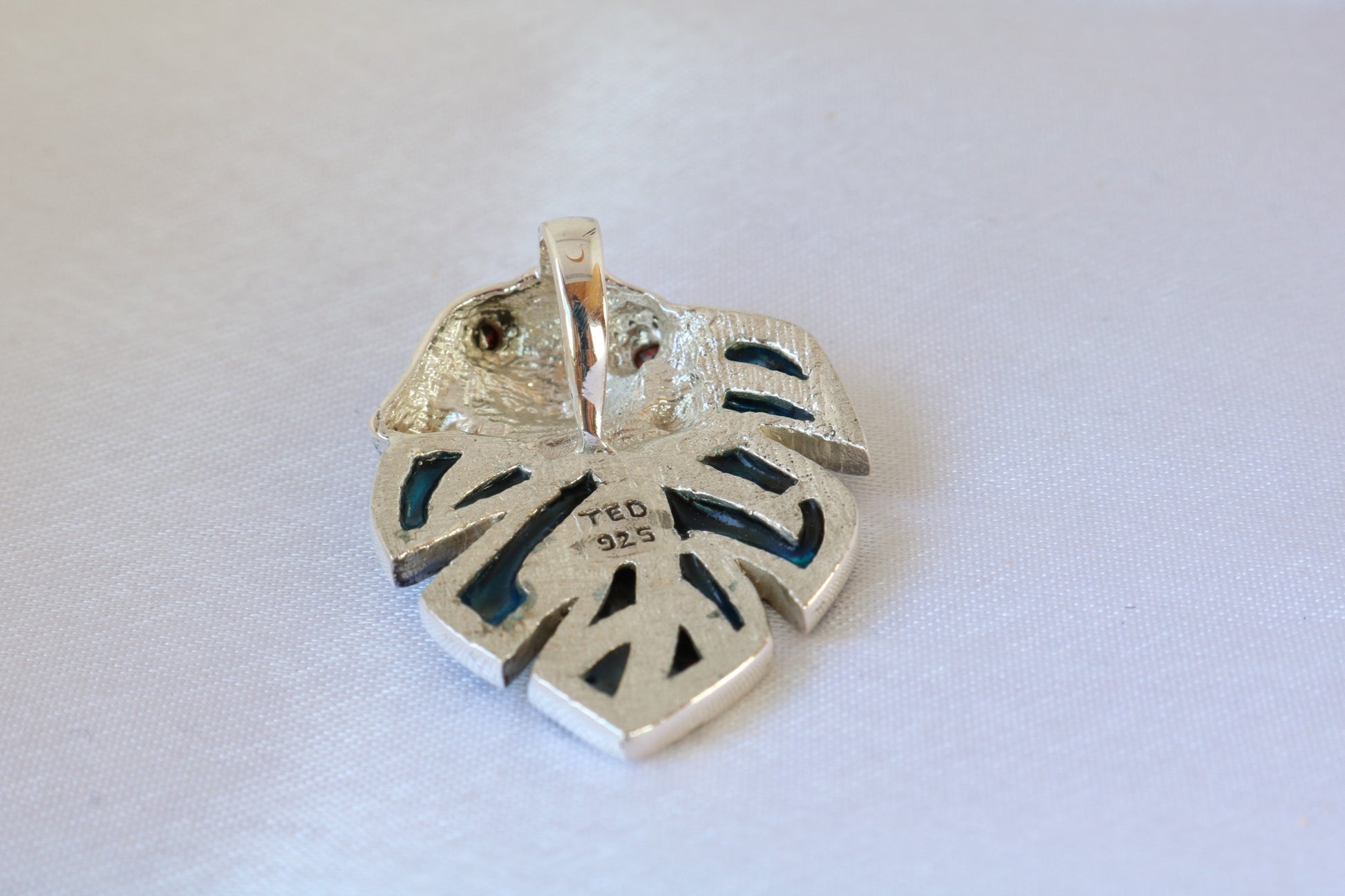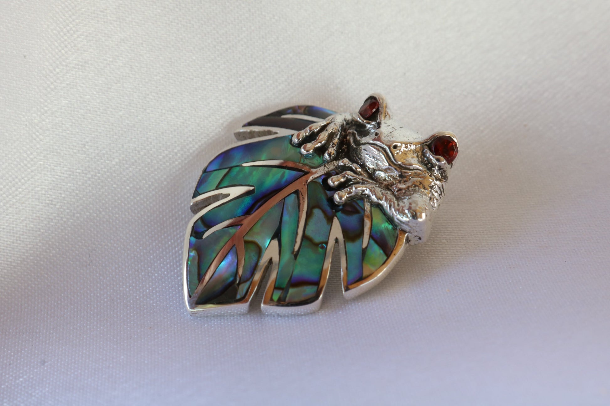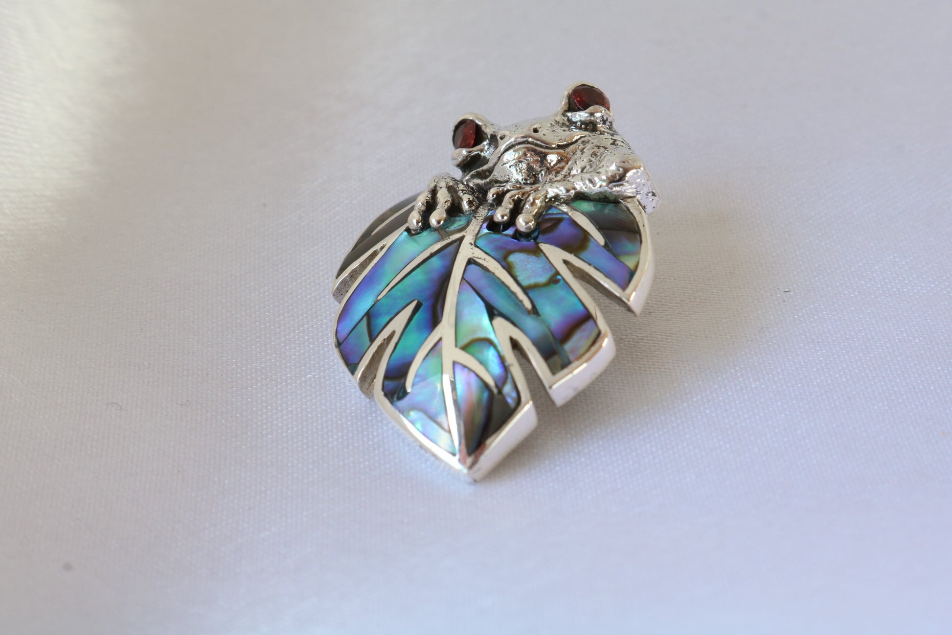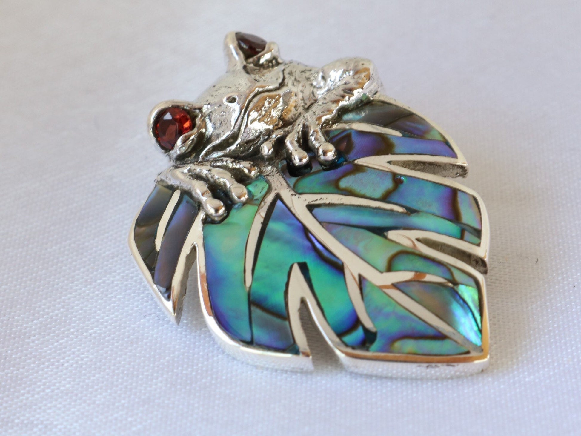 Frog on a leaf pendant necklace. Silver, abalone shell and garnet eyes.