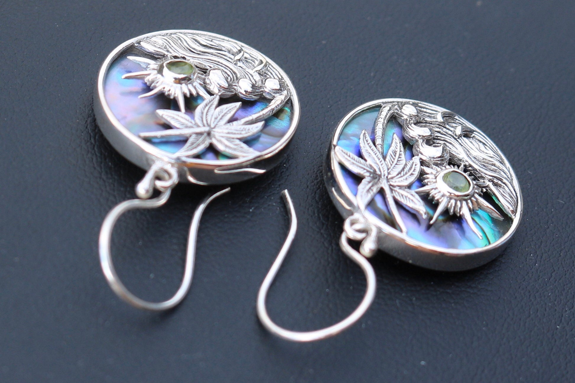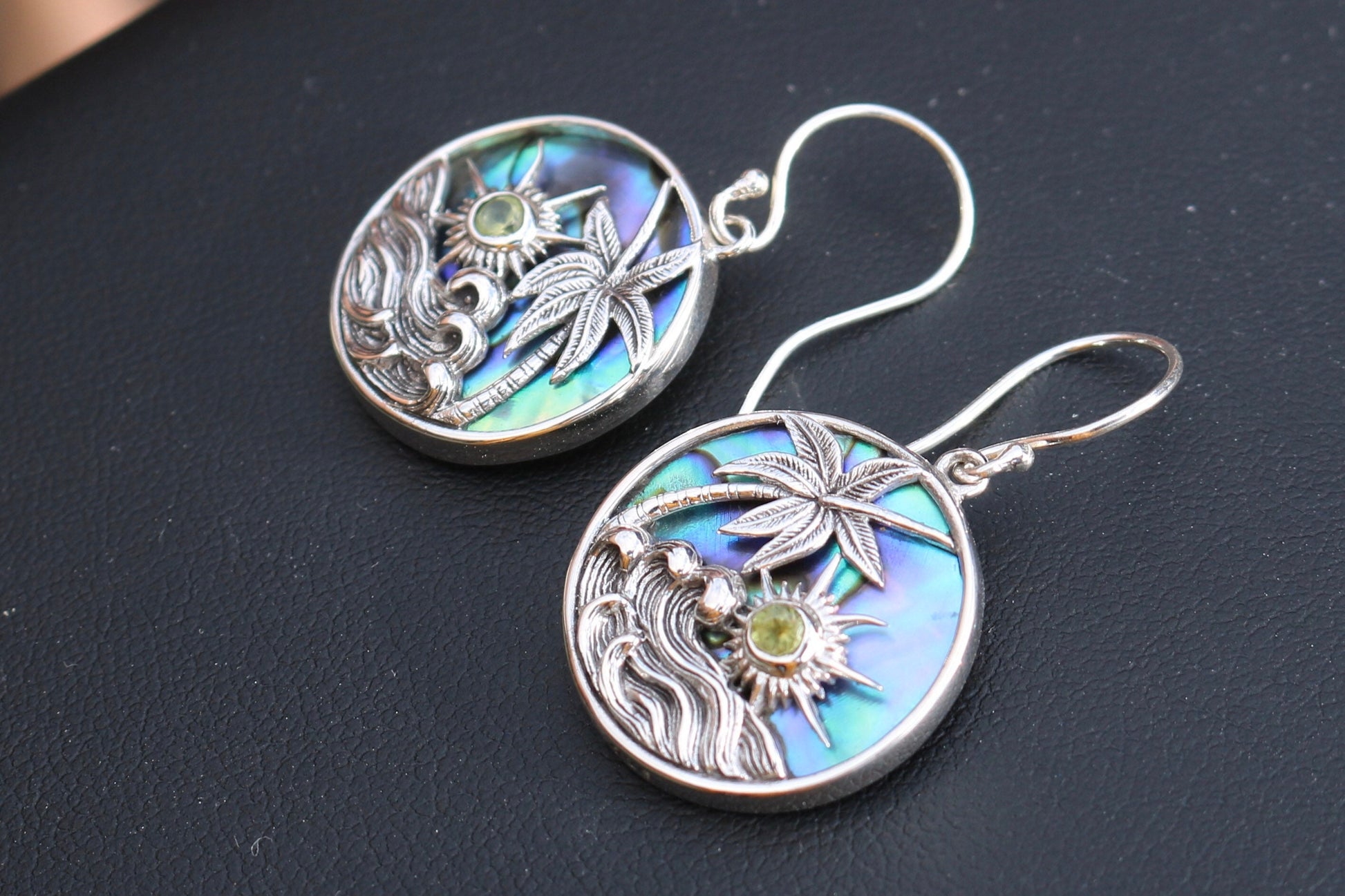 Hawaiian Sunset Wave Palm Tree Peridot Abalone Shell Earrings. Sterling Silver.
