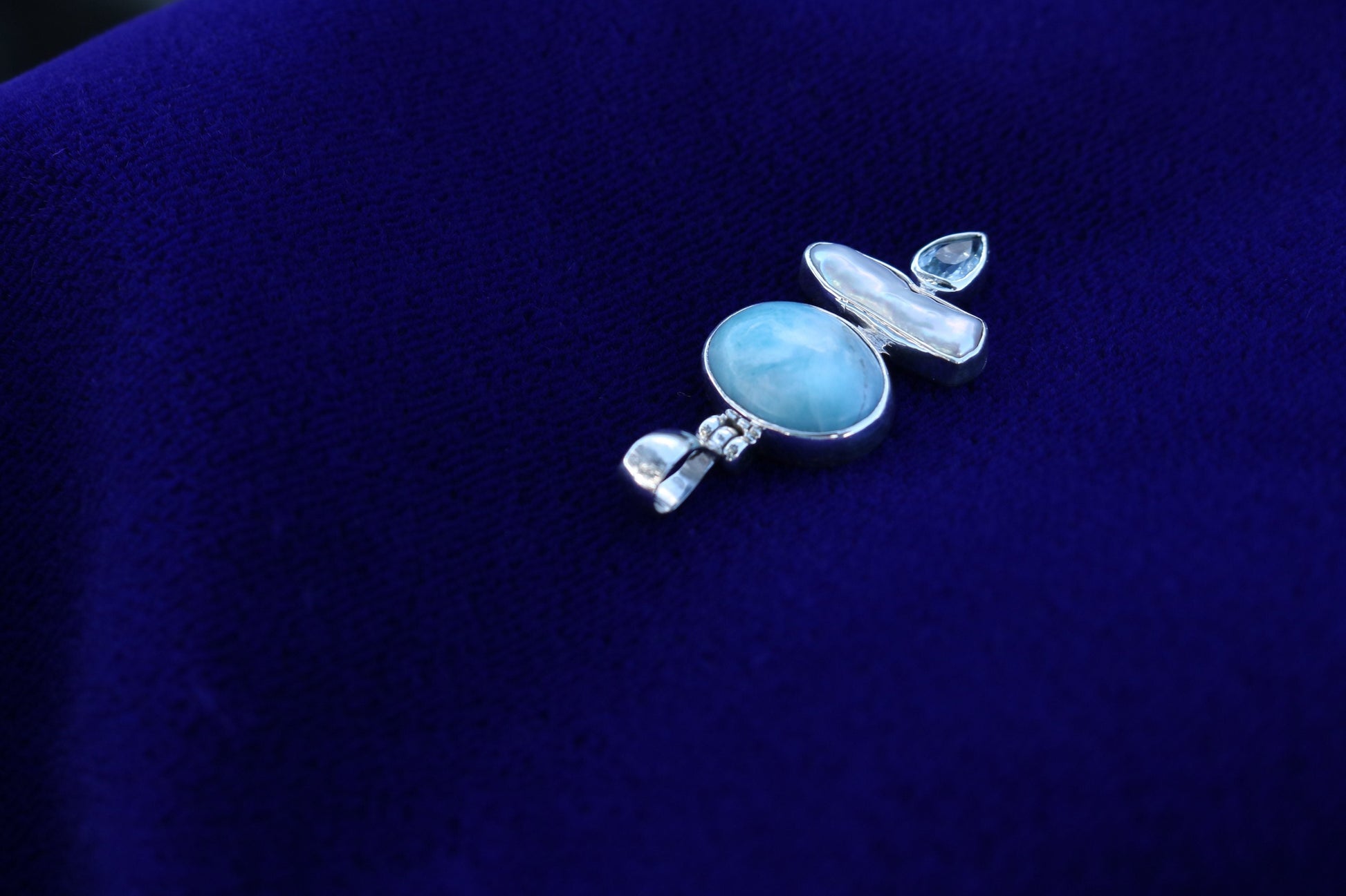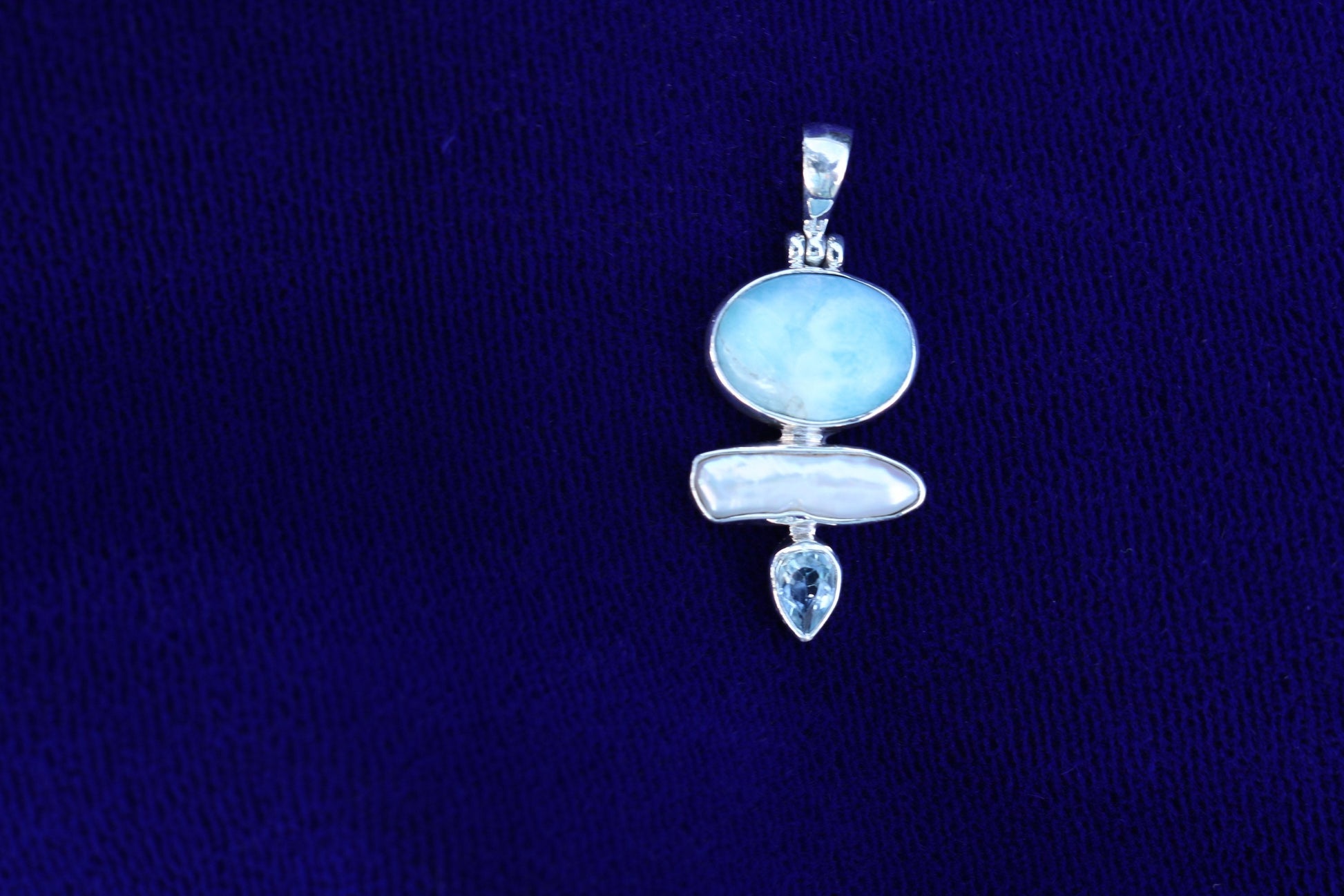 Larimar, Pearl and Blue Topaz Triple Pendant Necklace. Sterling Silver.