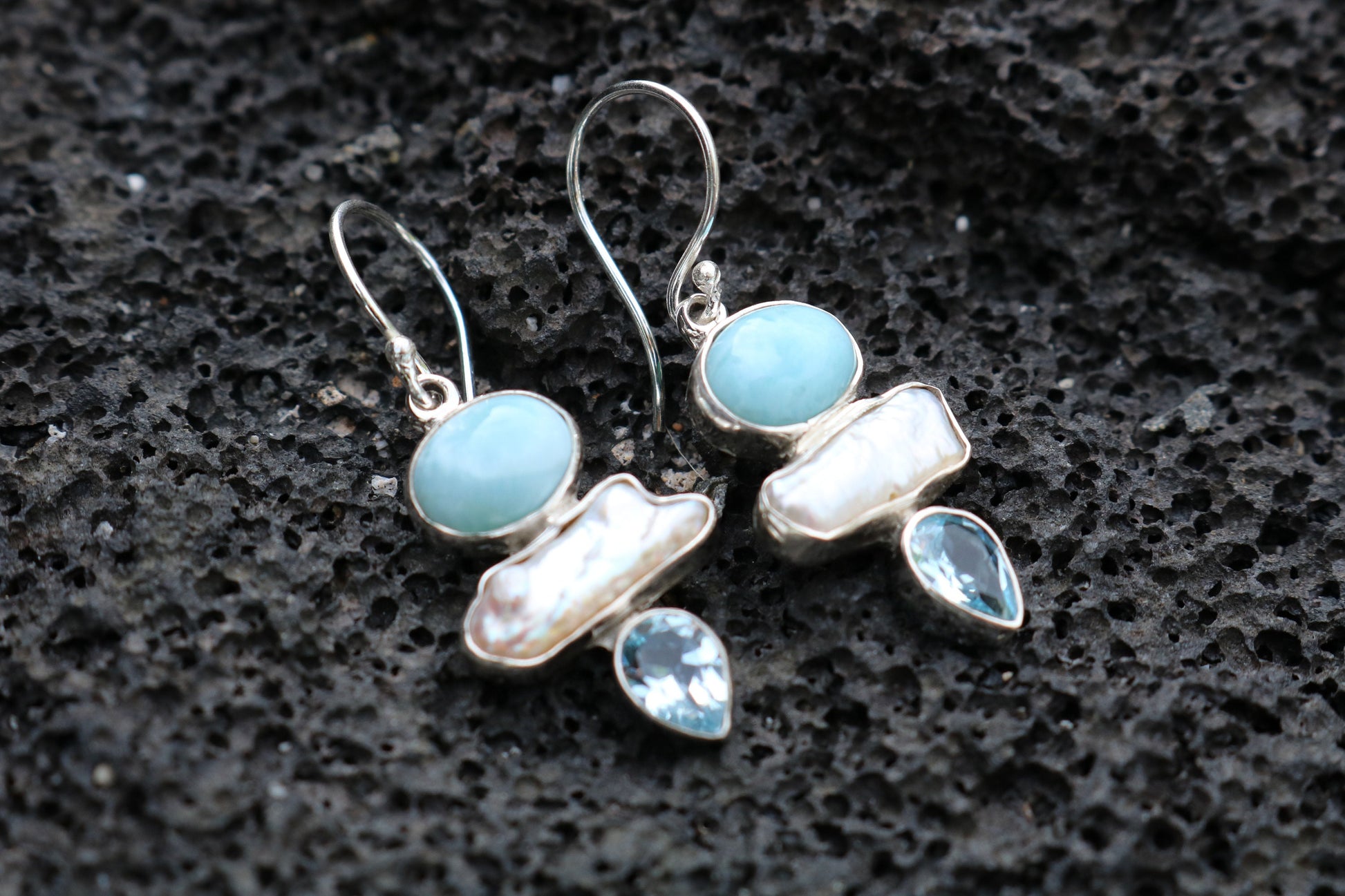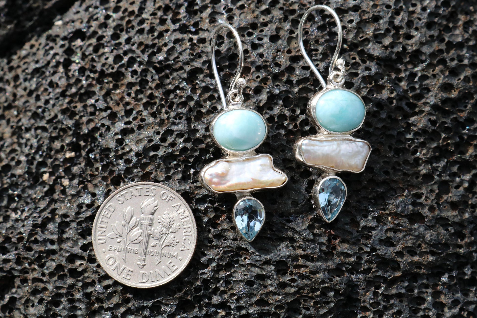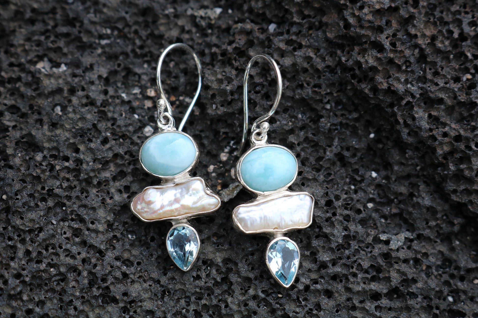 Larimar Pearl Blue Topaz Earrings. Sterling Silver.