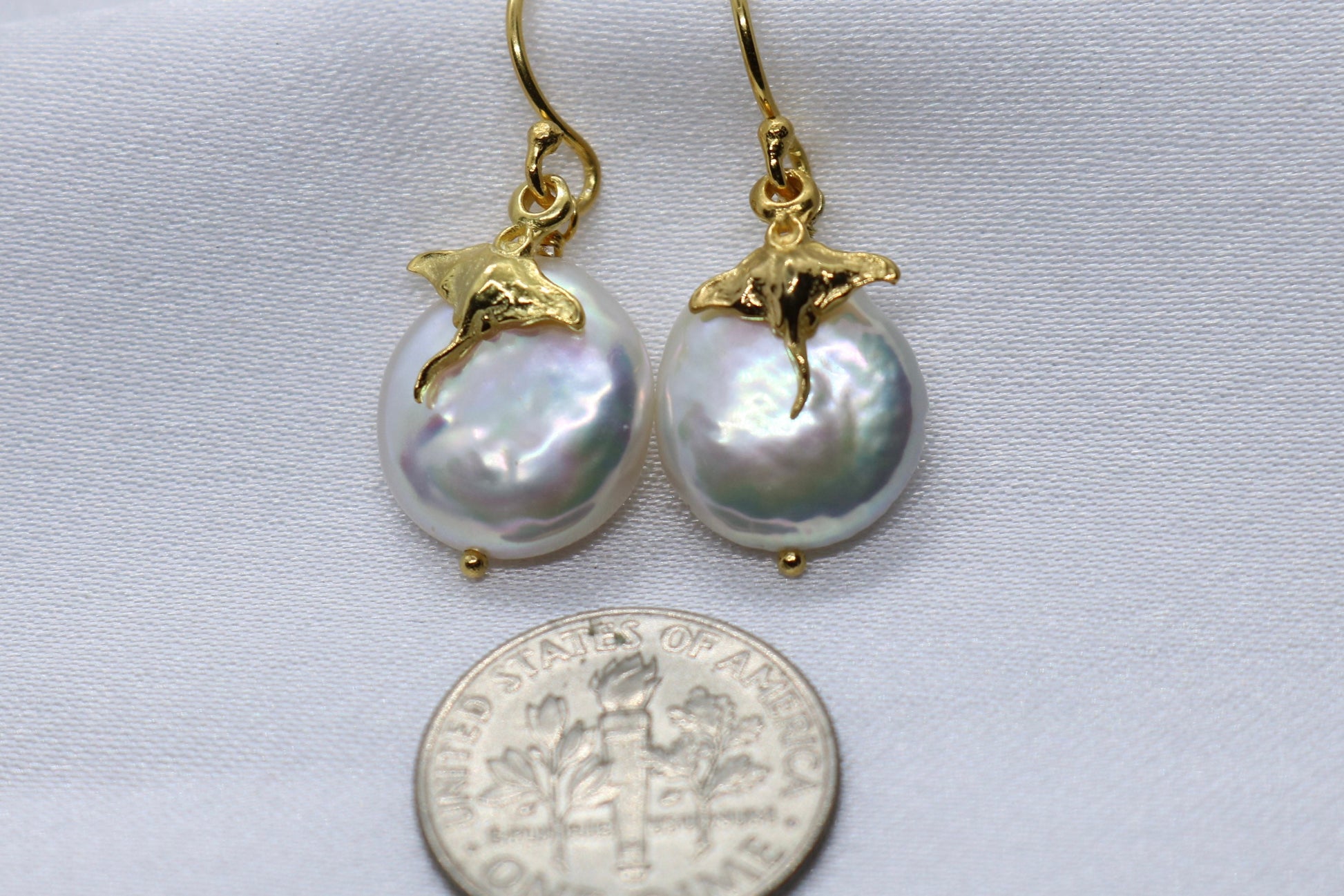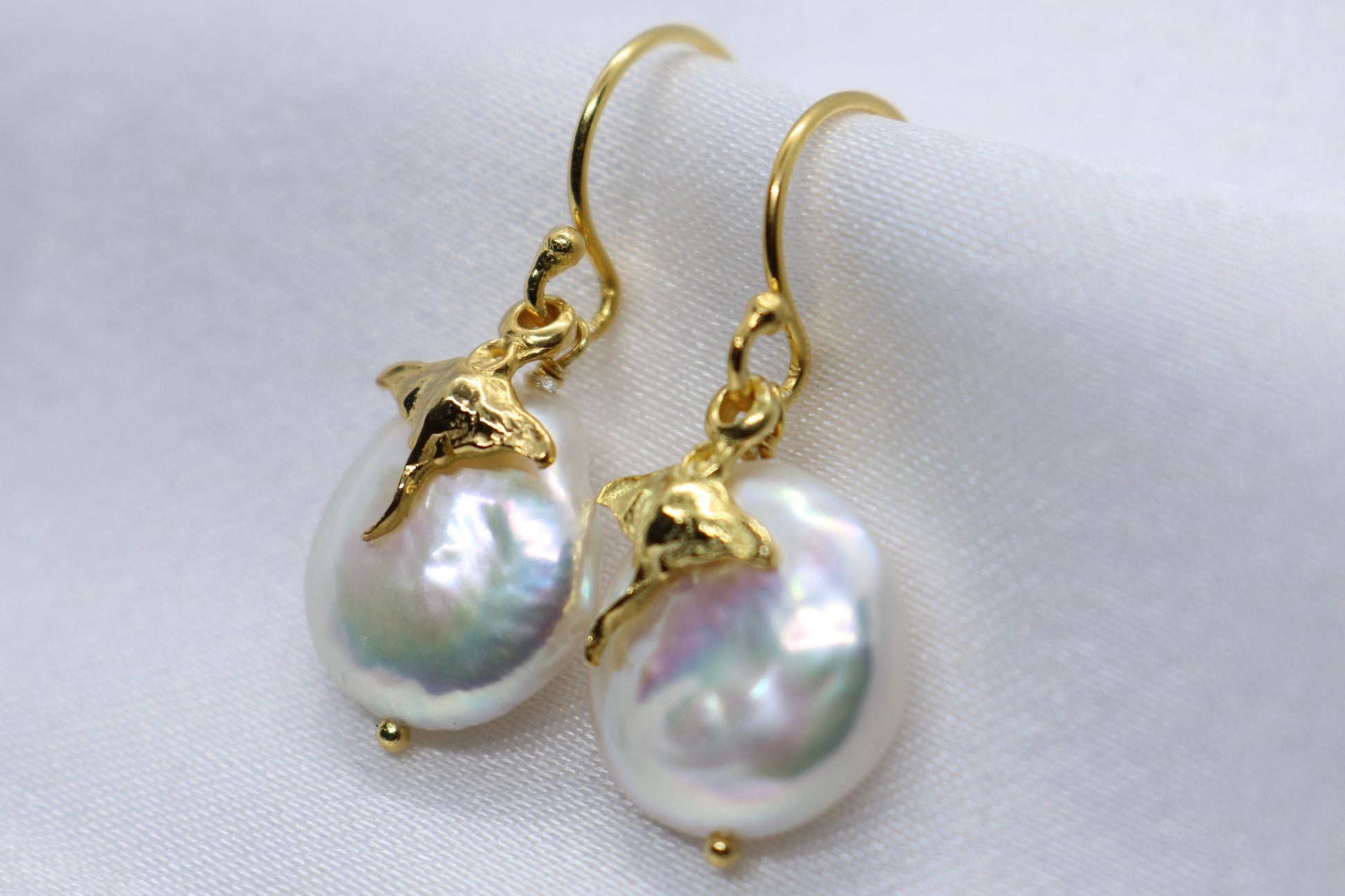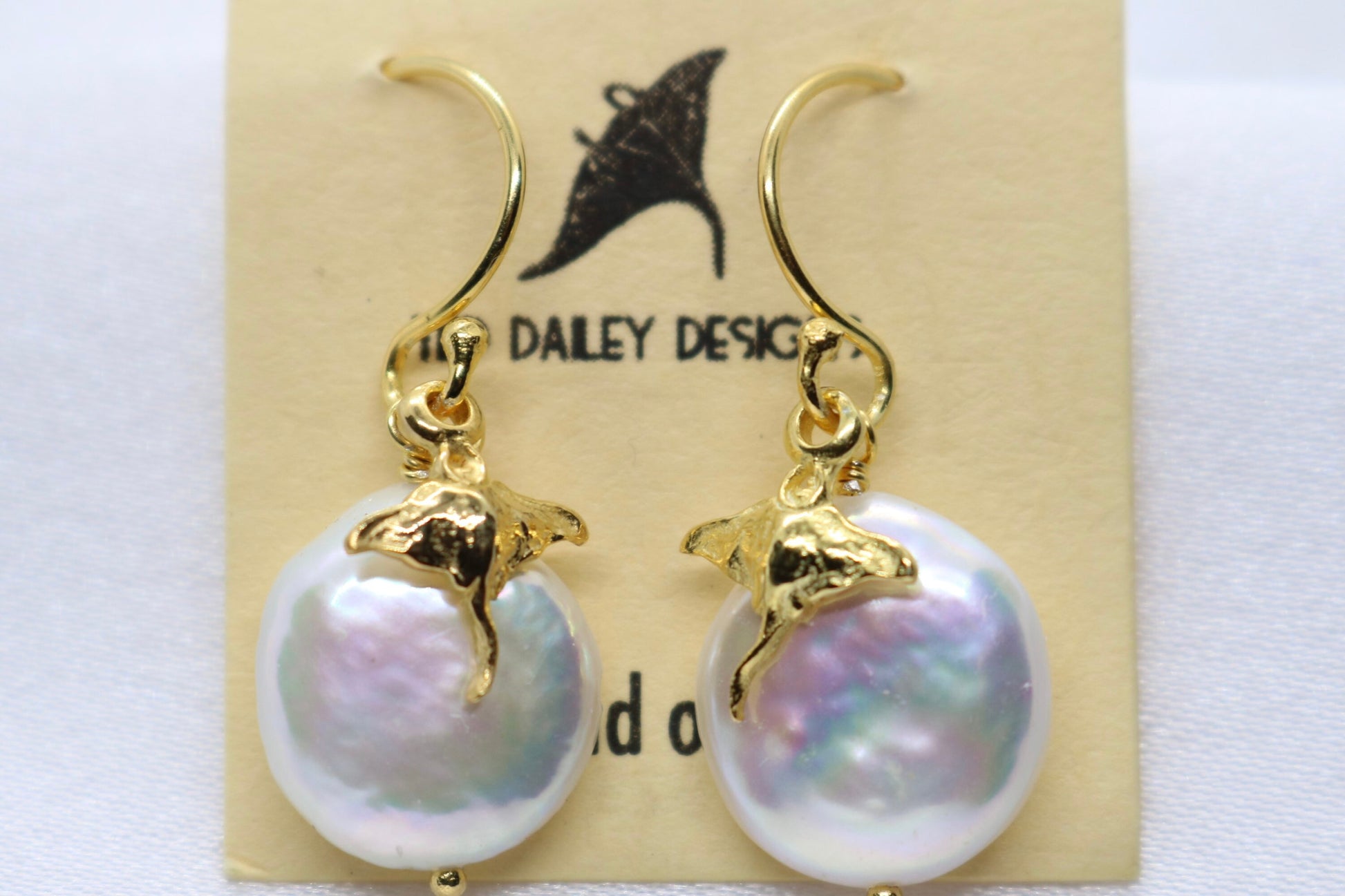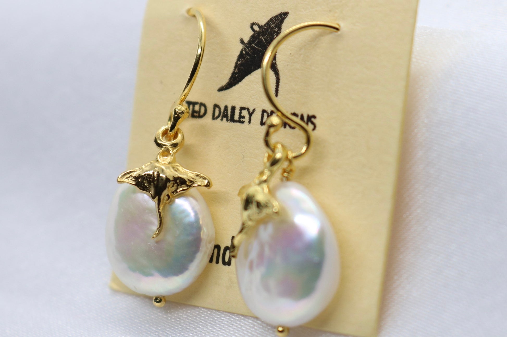 Manta Ray Pearl 18k gold vermeil charm earrings