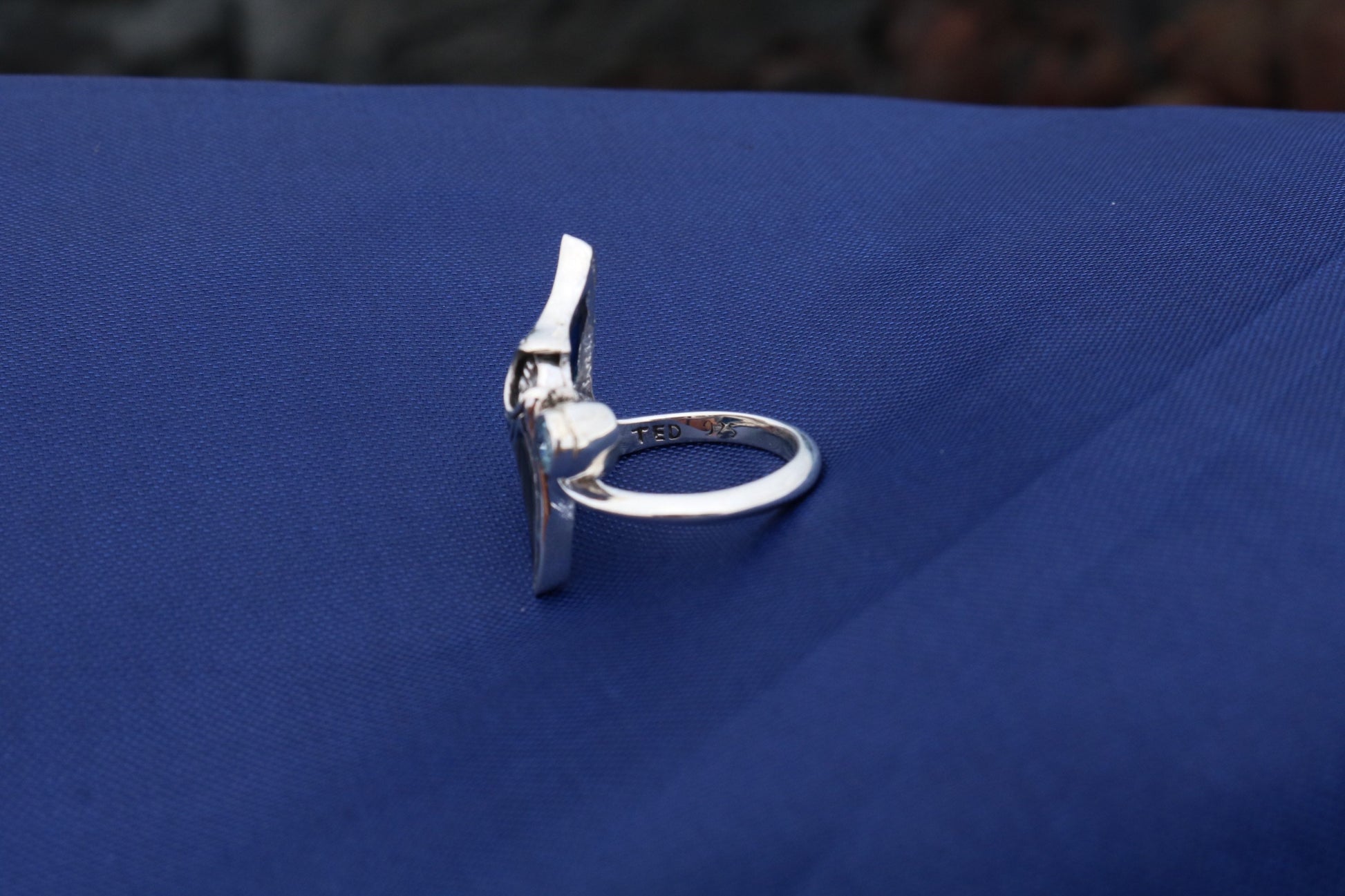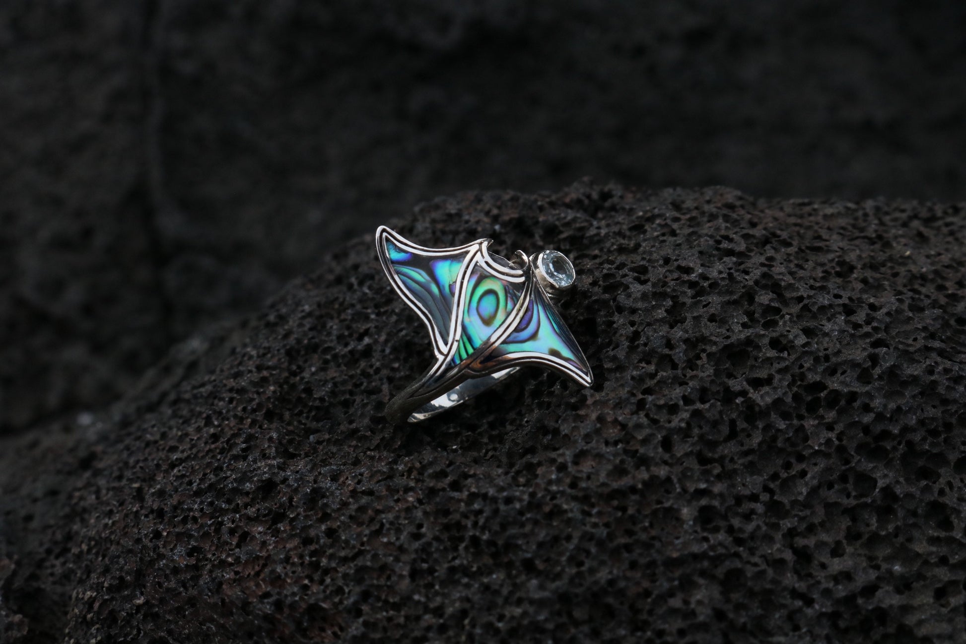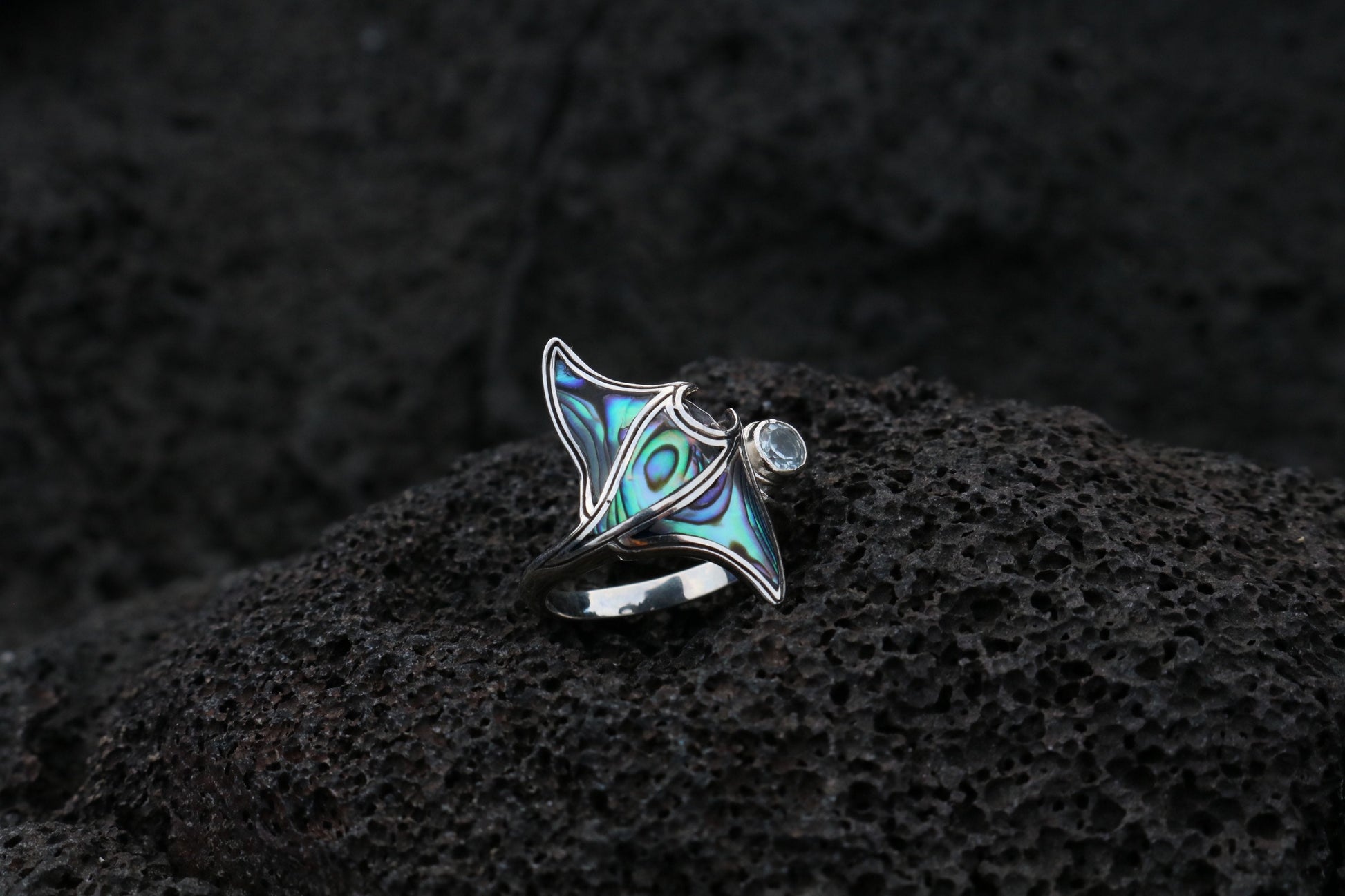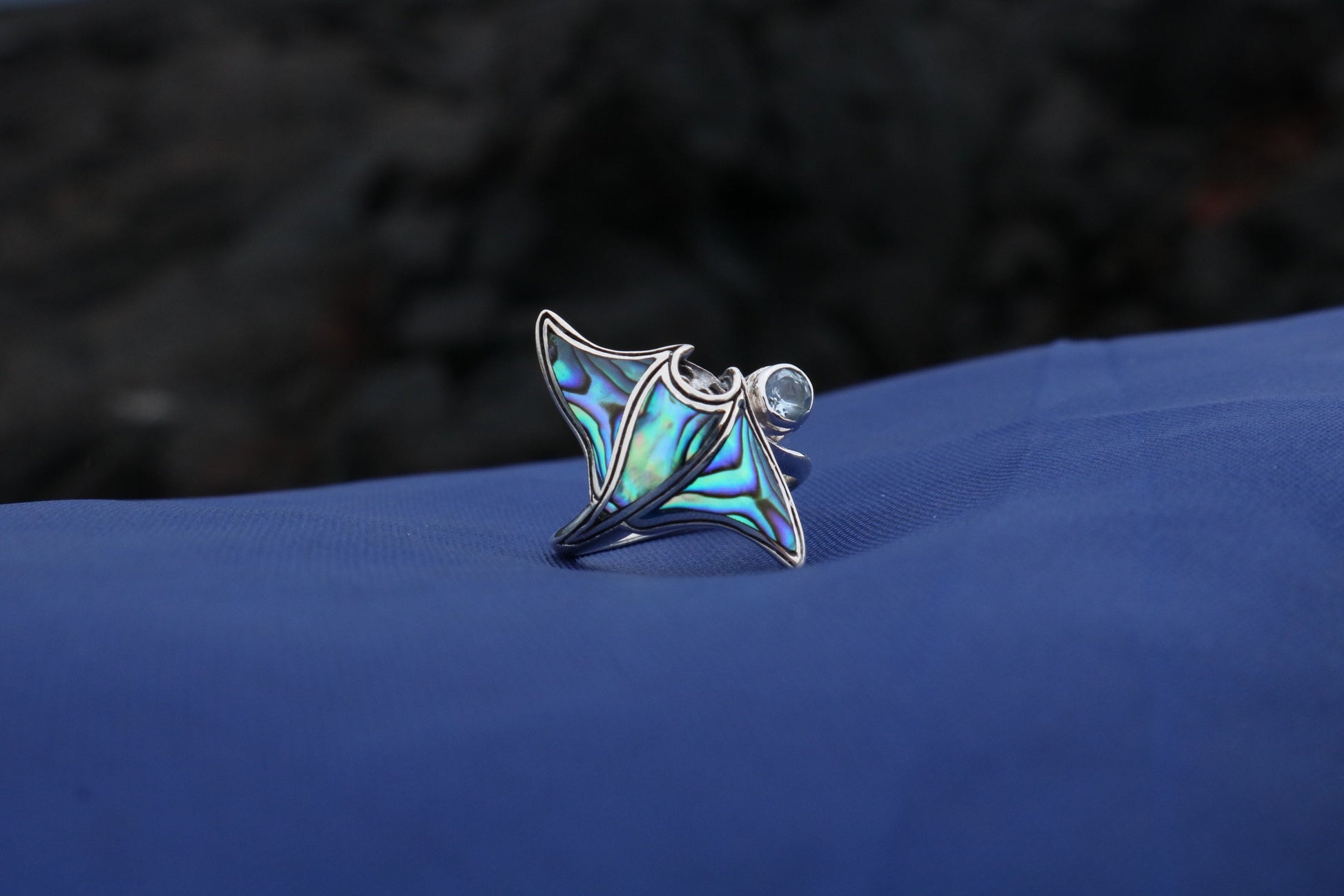 Manta Ray Ring Hawaiian Hahalua. Abalone Paua Shell. Blue Topaz. Sterling Silver.