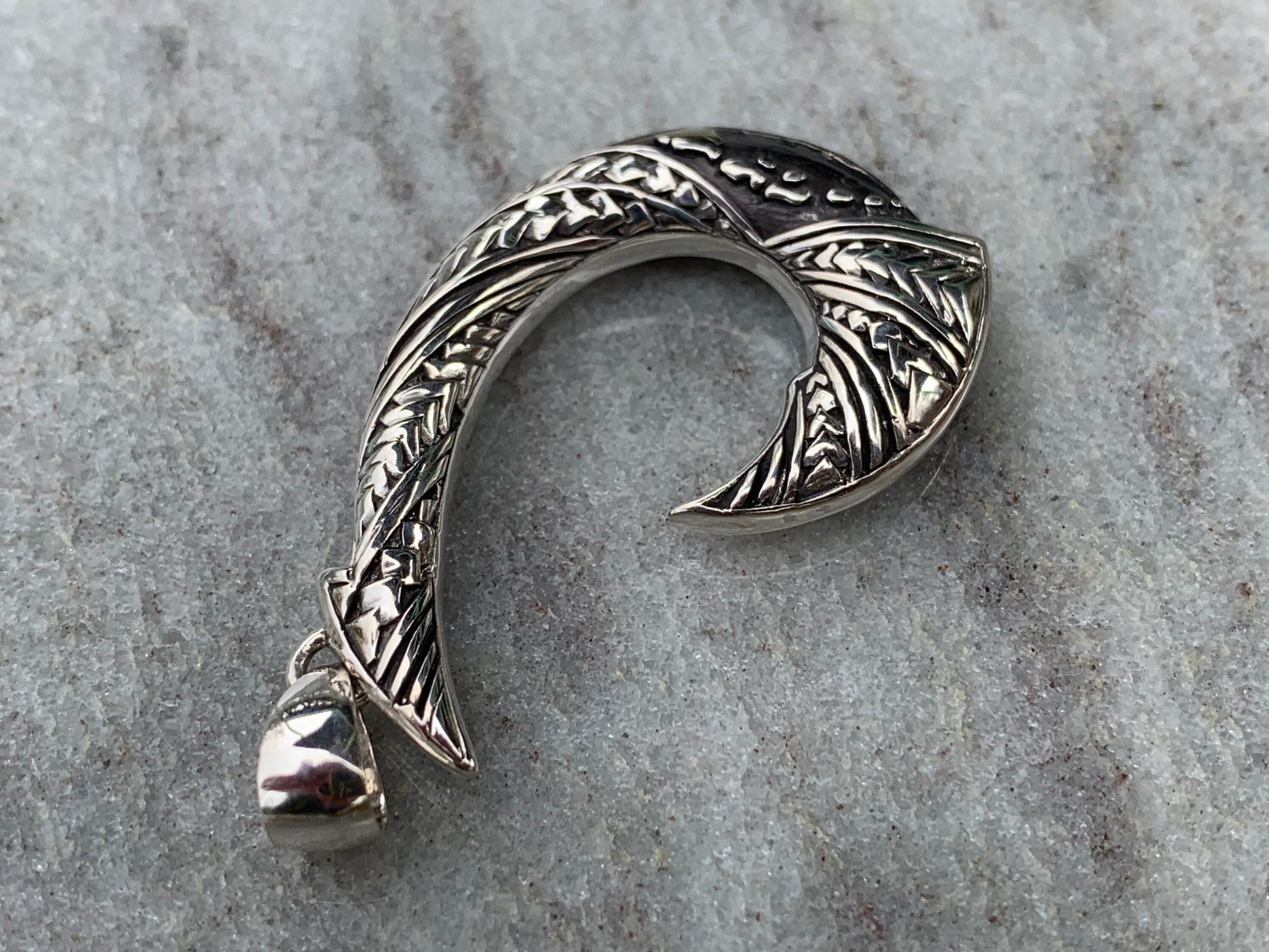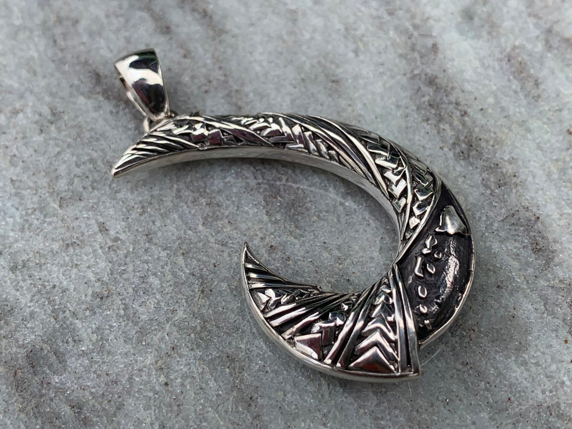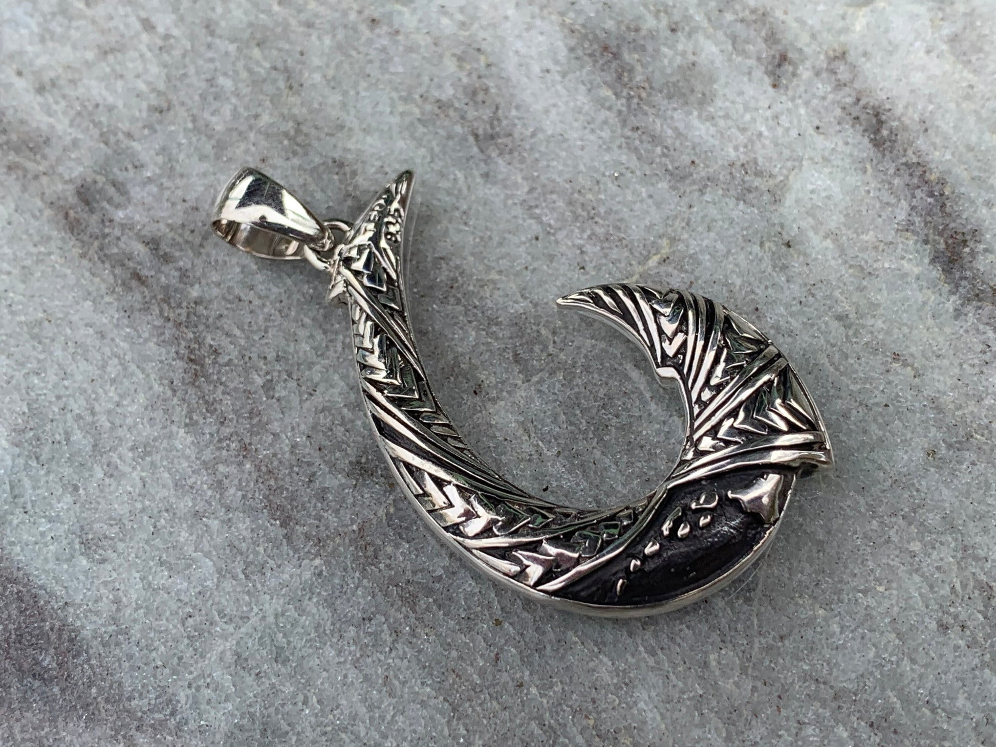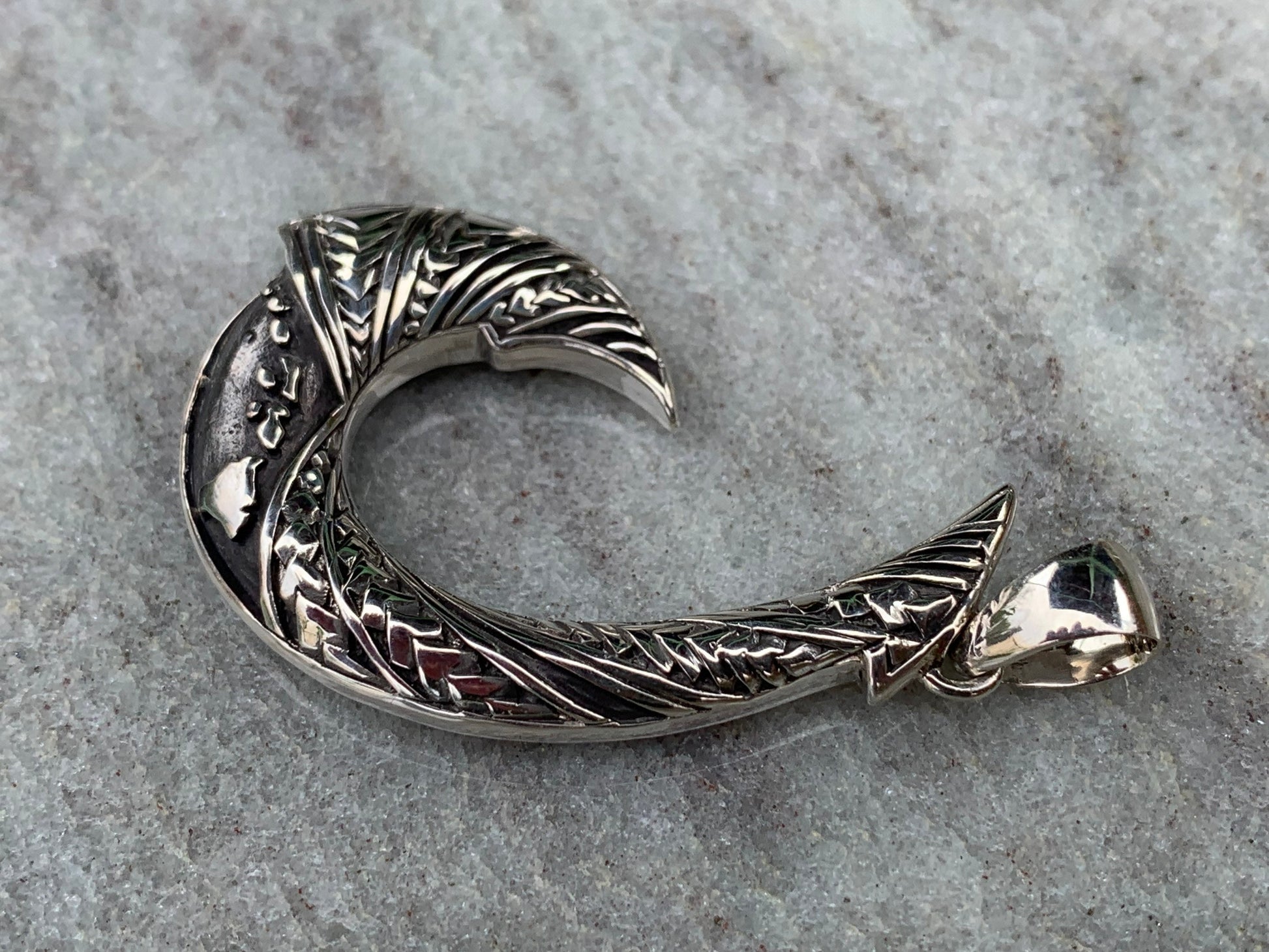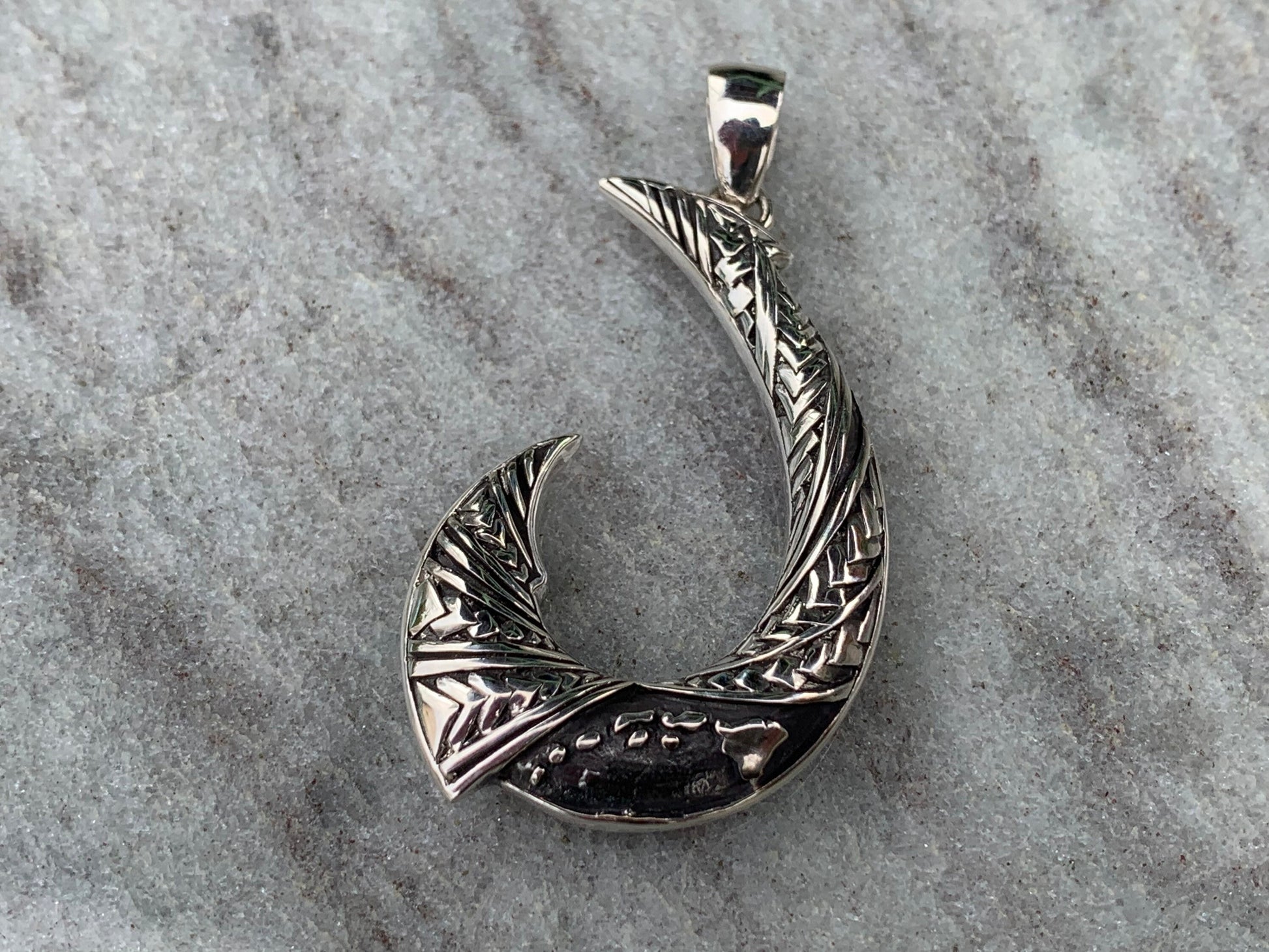 Maui Hook Hawaiian Islands Chain - Kauai Oahu Maui Big Island Tribal Design Necklace Pendant. Sterling Silver.