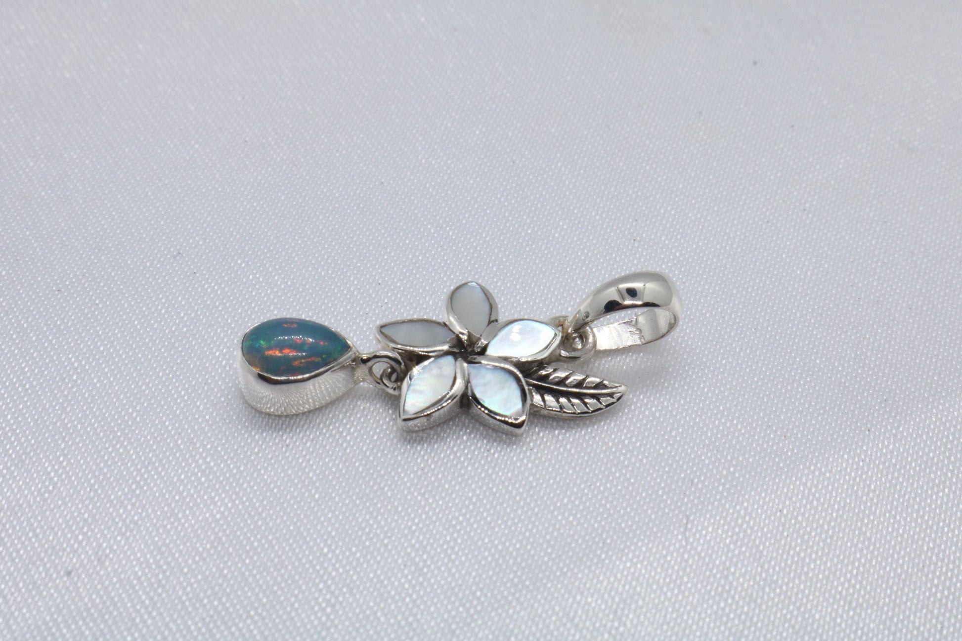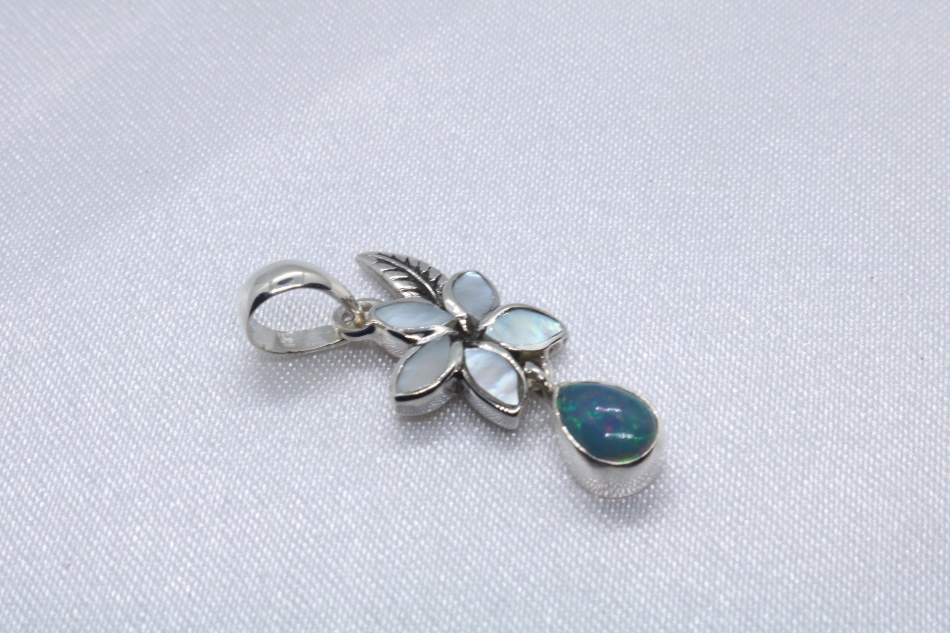 Opal Plumeria Flower Silver Mother of Pearl Necklace Pendant
