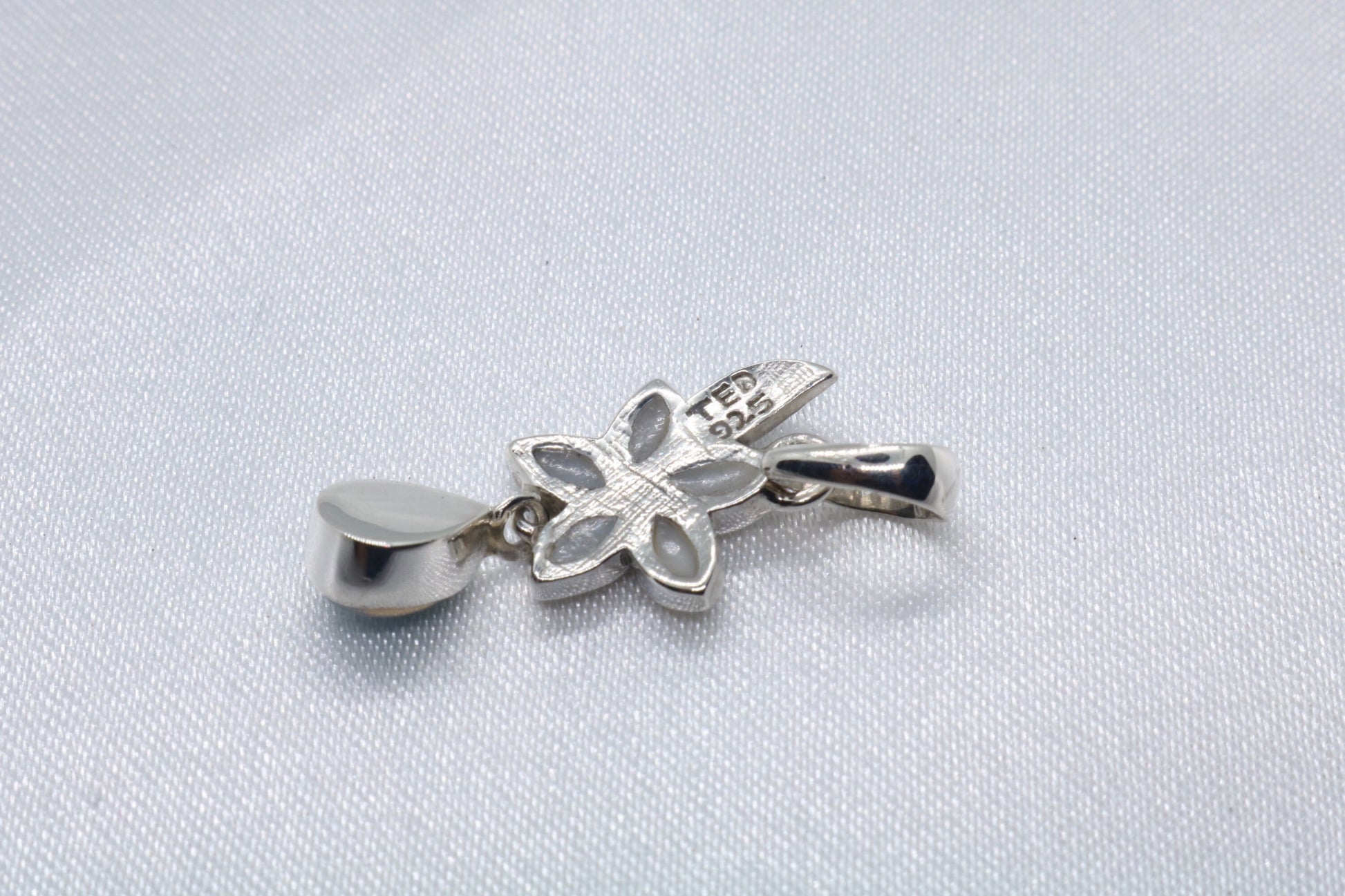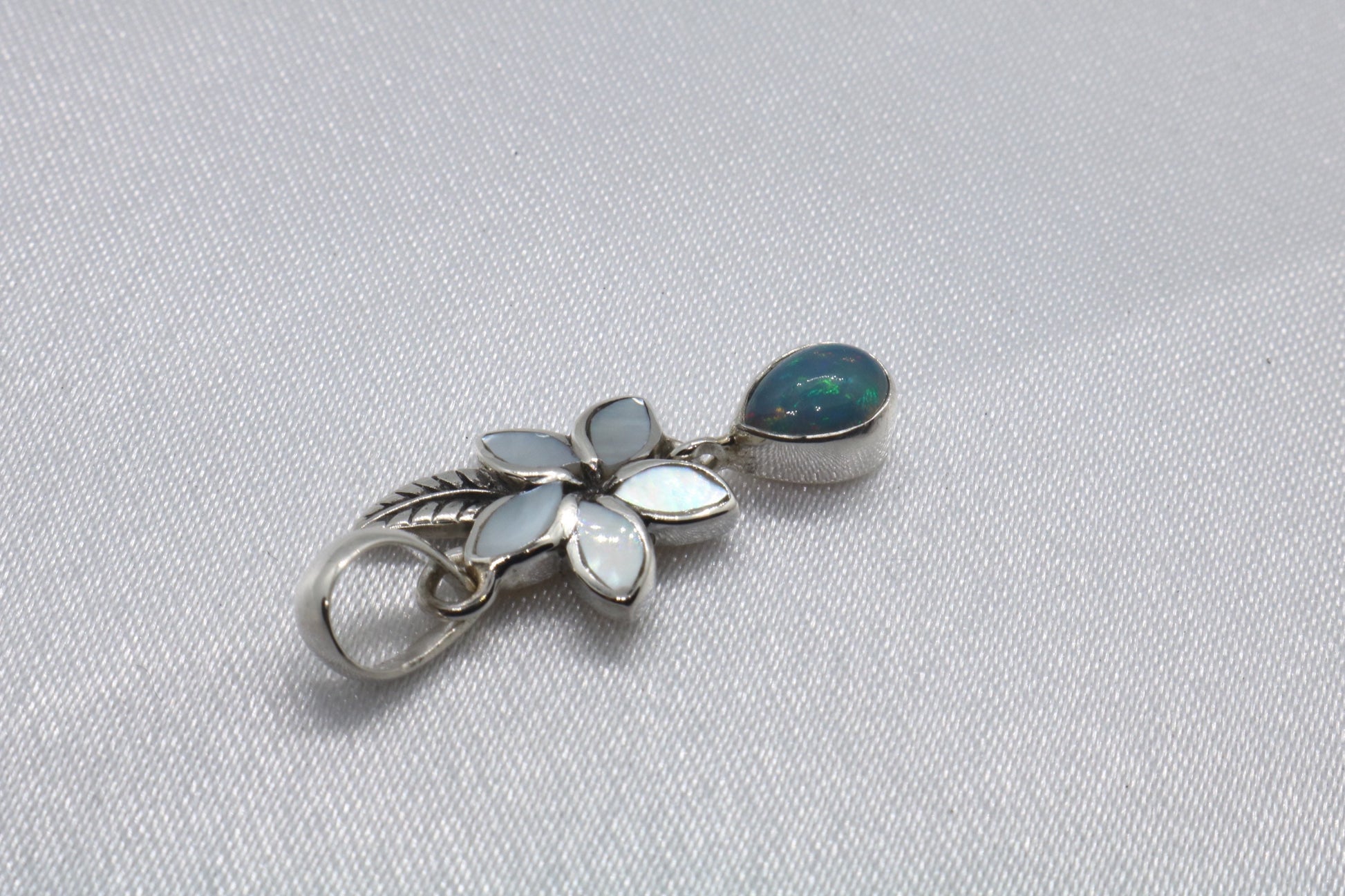 - Opal Plumeria Flower Silver Mother of Pearl Necklace Pendant All pendants will be shipped on black satin silk cords, no chains included.
