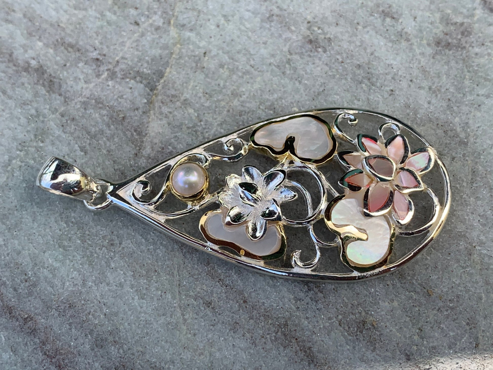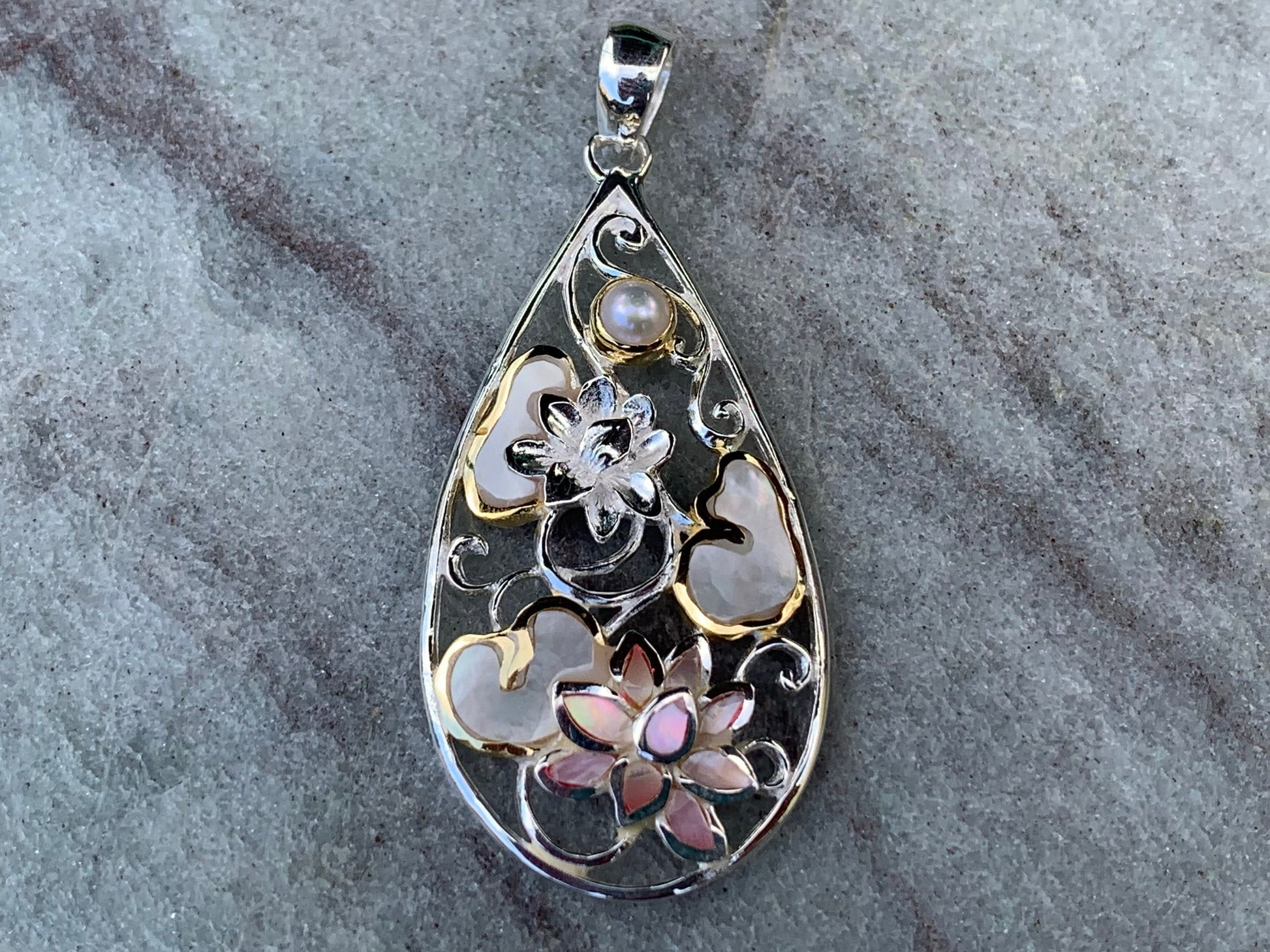 Pink Lotus Flower Necklace Pendant. Sterling Silver, Pearl, Gold, Mother of Pearl.