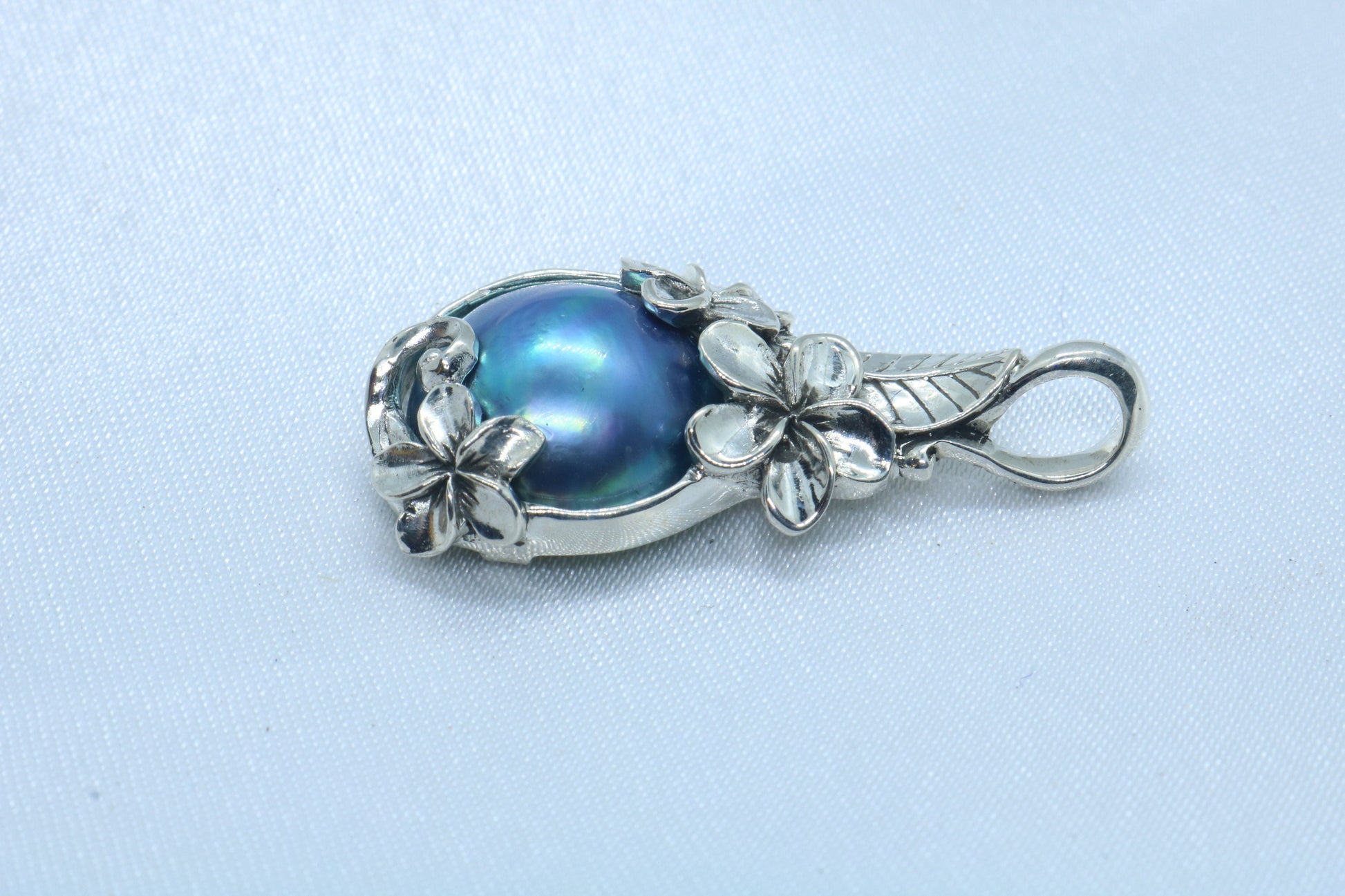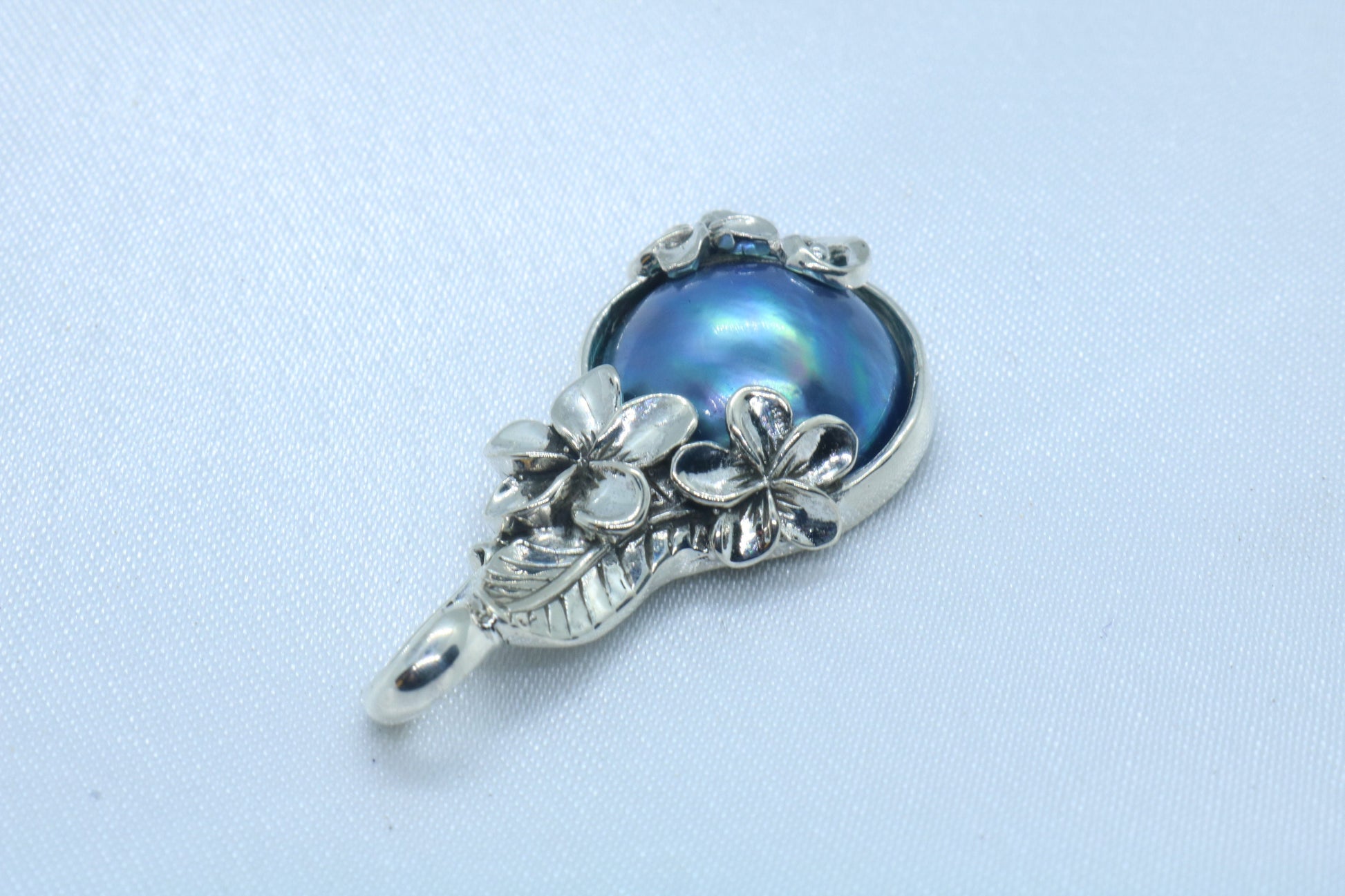 Plumeria Flower Blue Mabe Pearl Silver Pendant Necklace