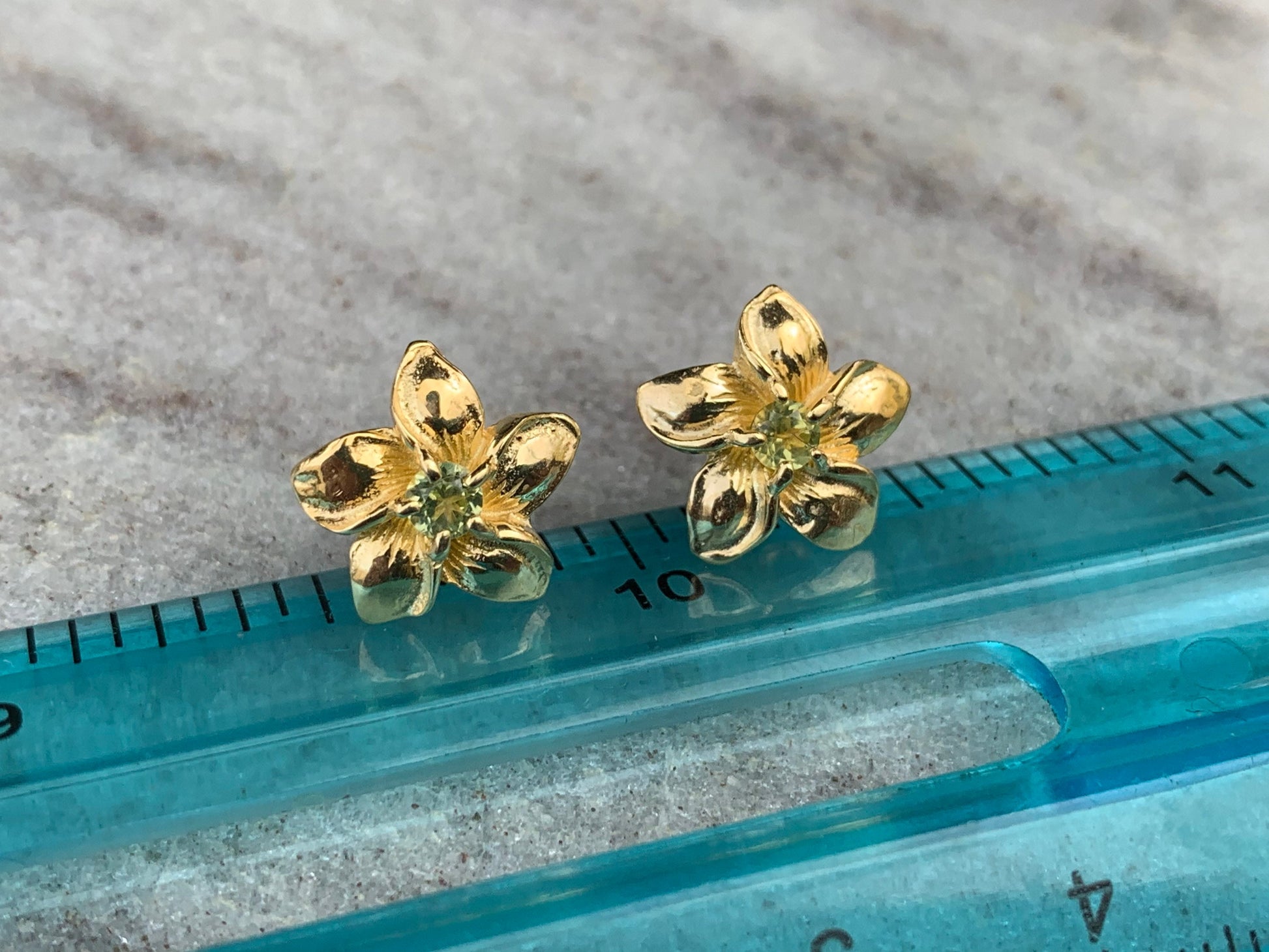 Plumeria Flower Gold Vermeil Earrings Studs. Peridot.