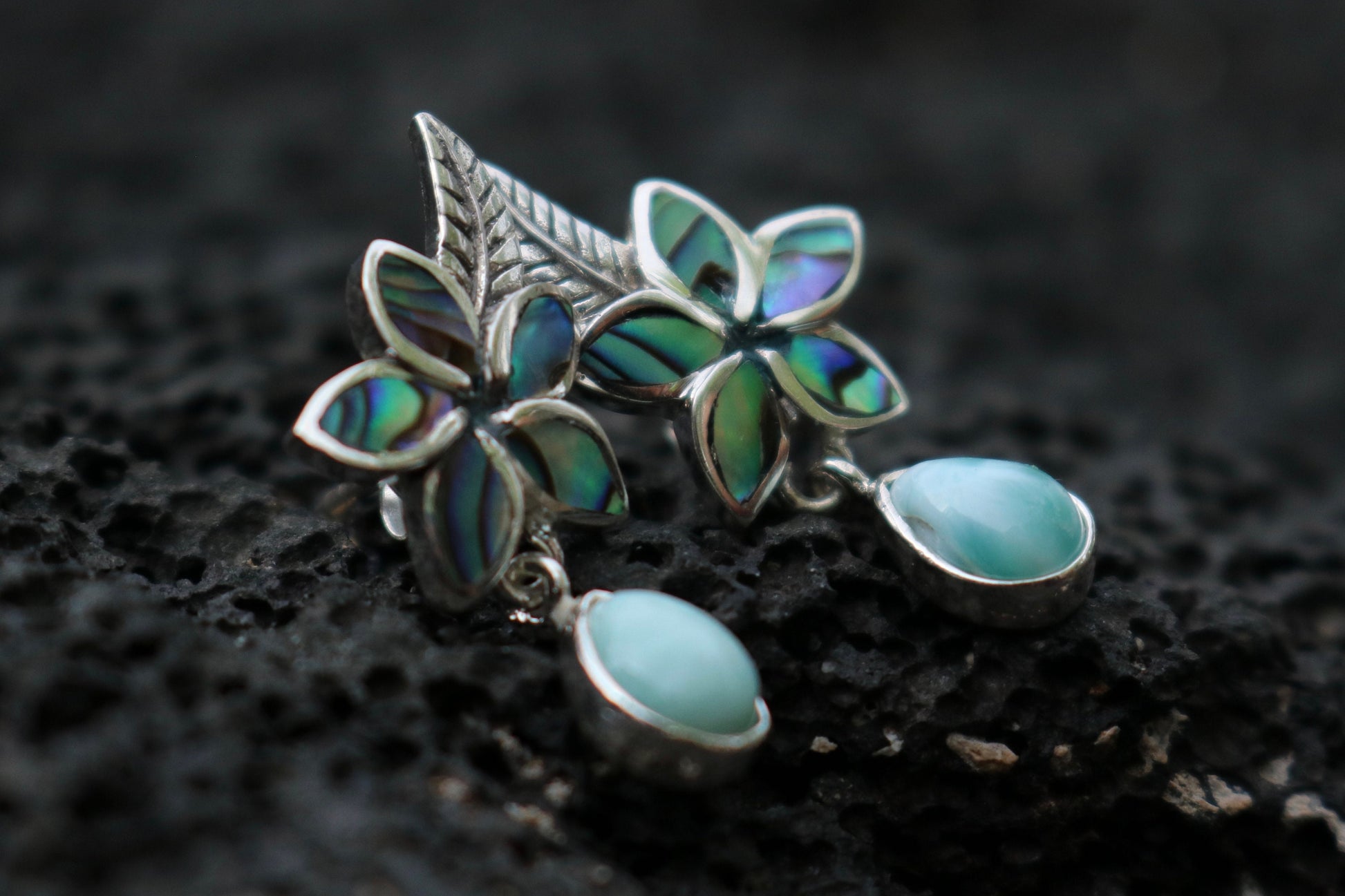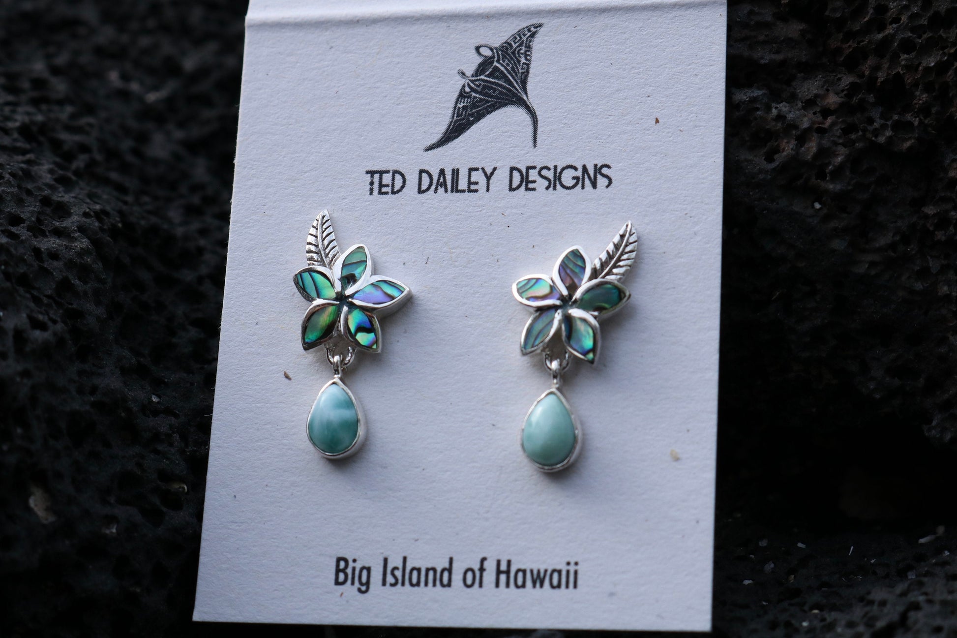 Plumeria Flower Larimar Abalone Shell Stud Earrings. Sterling Silver.