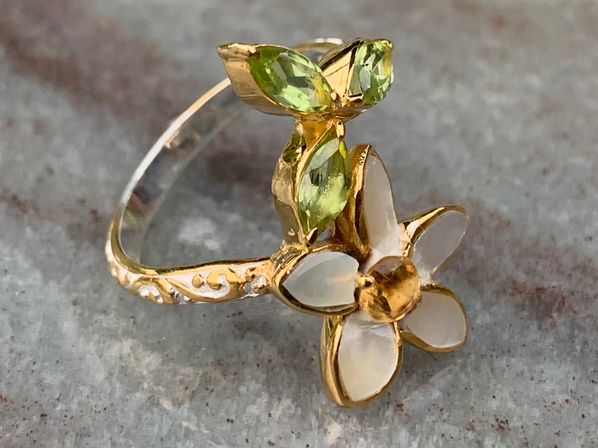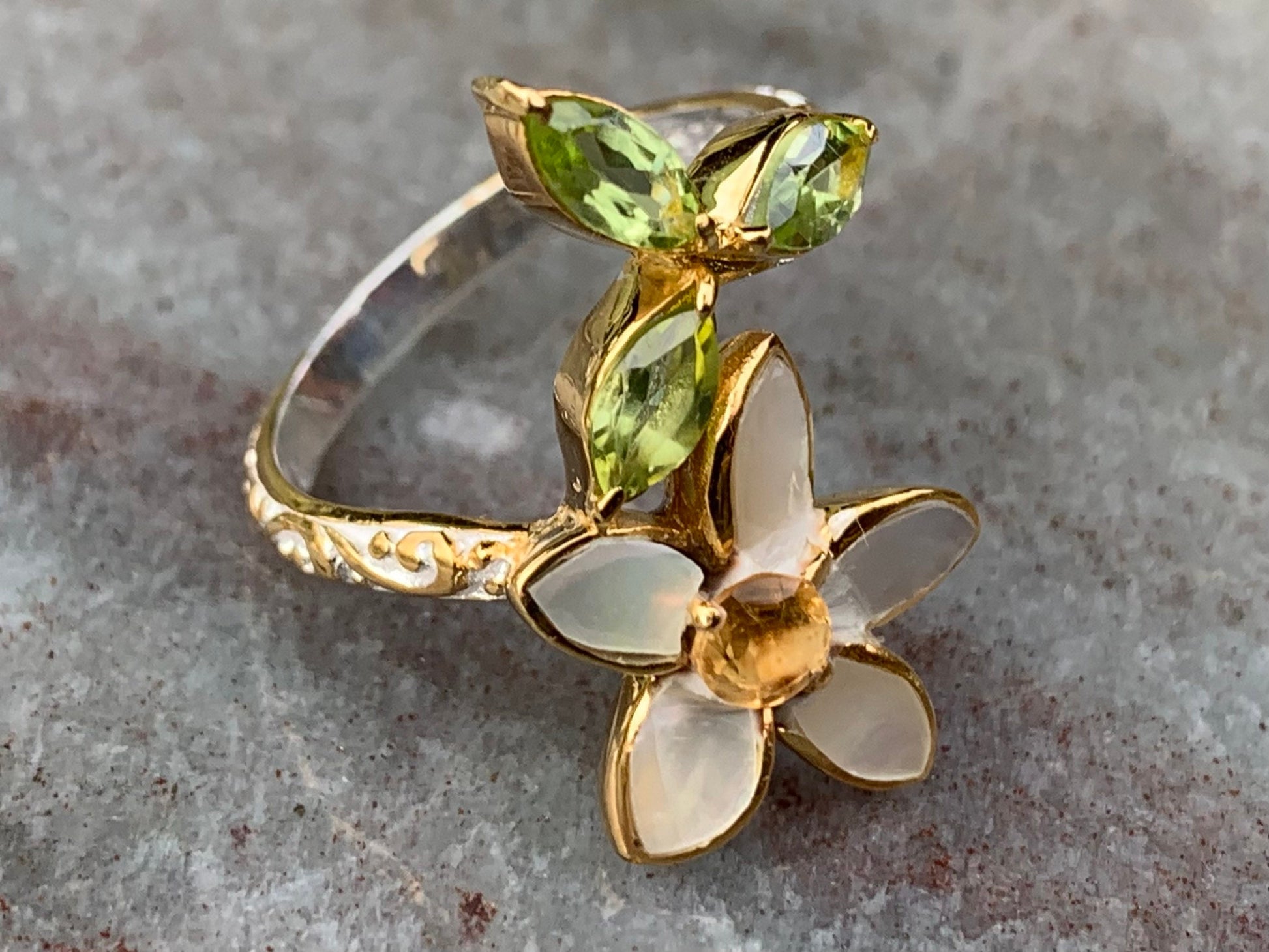 Plumeria Flower Ring. Gold, Silver, Citrine, Peridot, Mother of Pearl.