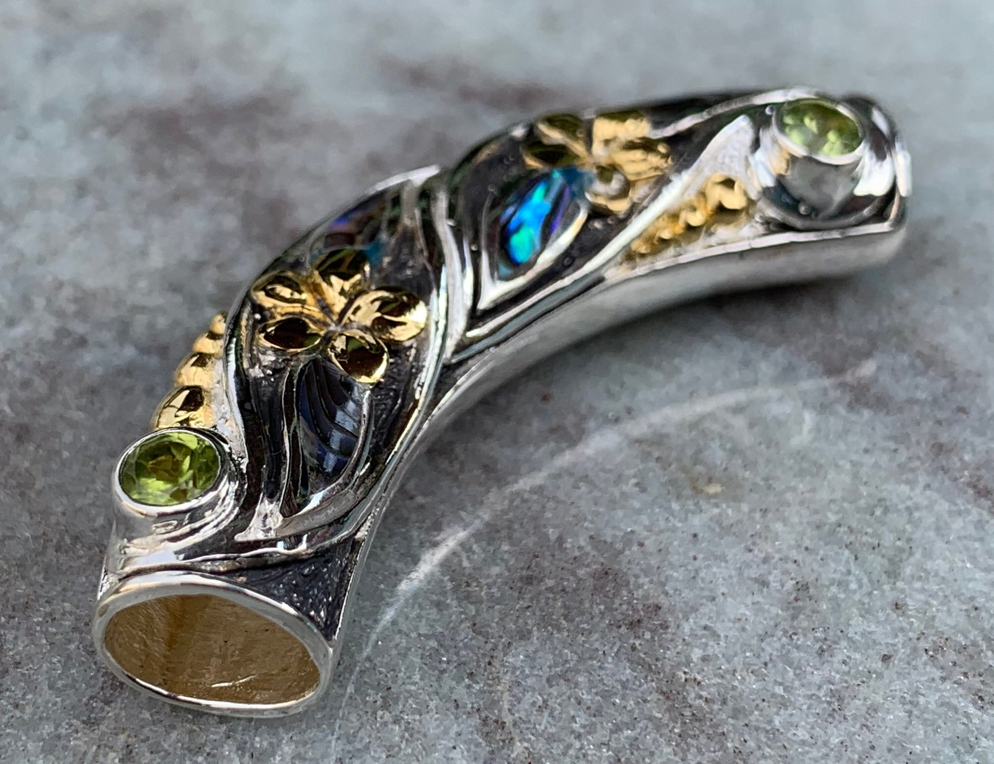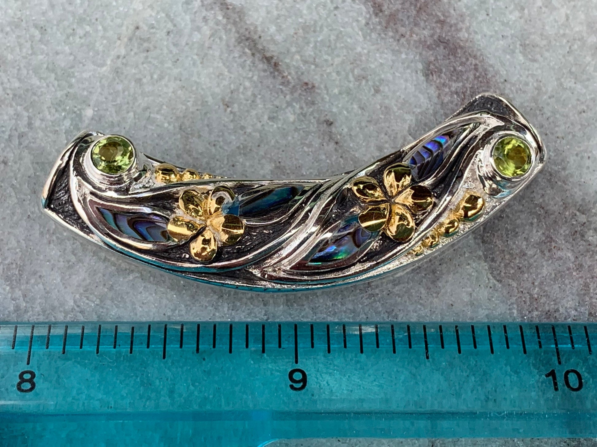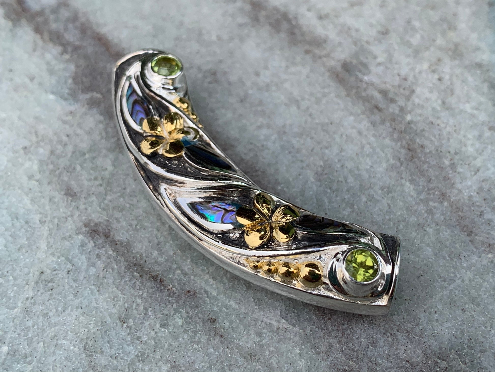 Plumeria Slider Necklace Pendant. 2 Peridot Gemstones, Abalone Shell, Sterling Silver, 18K Gold.