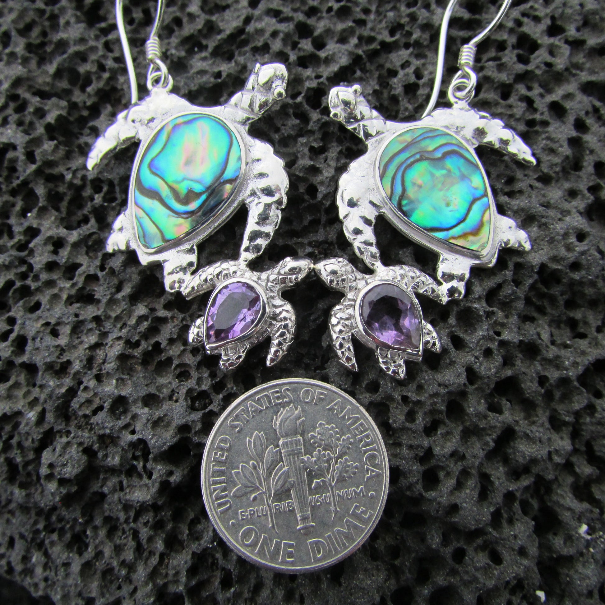 Double Turtle Earrings on Paua Shell w/Amethyst