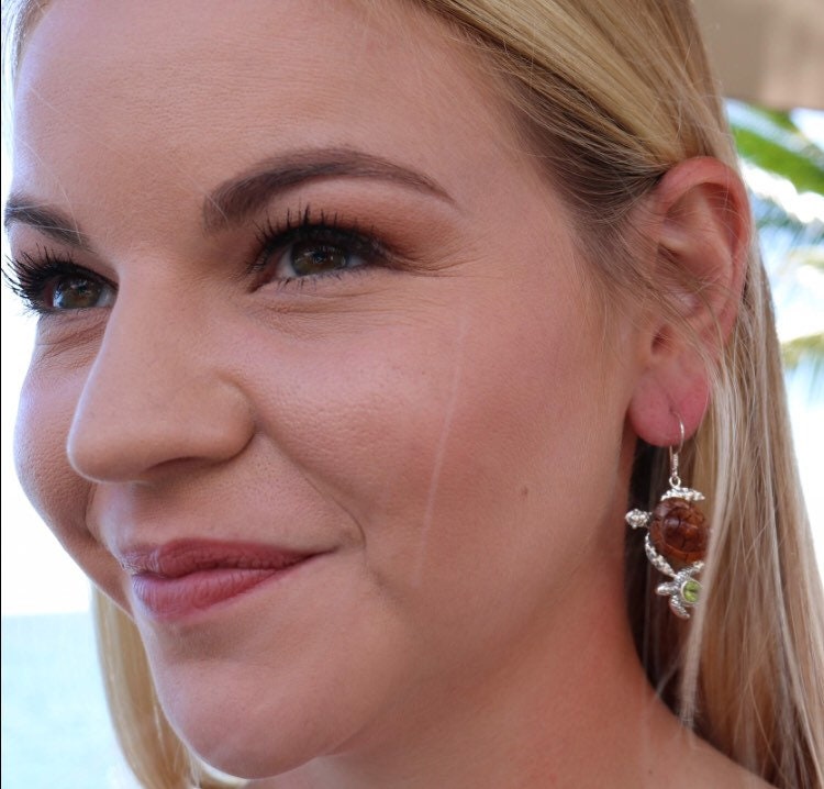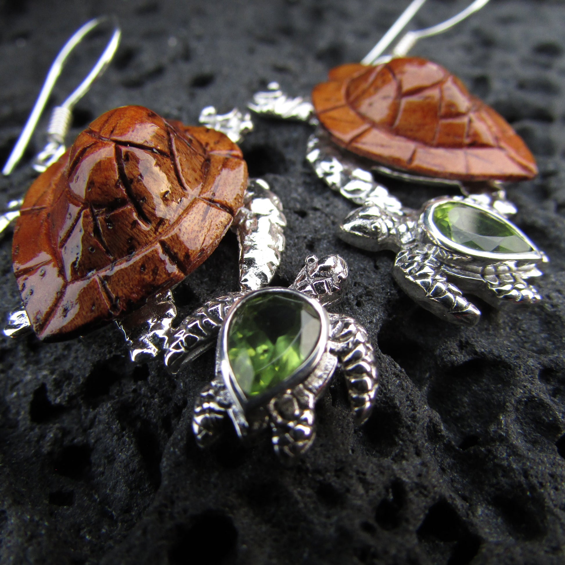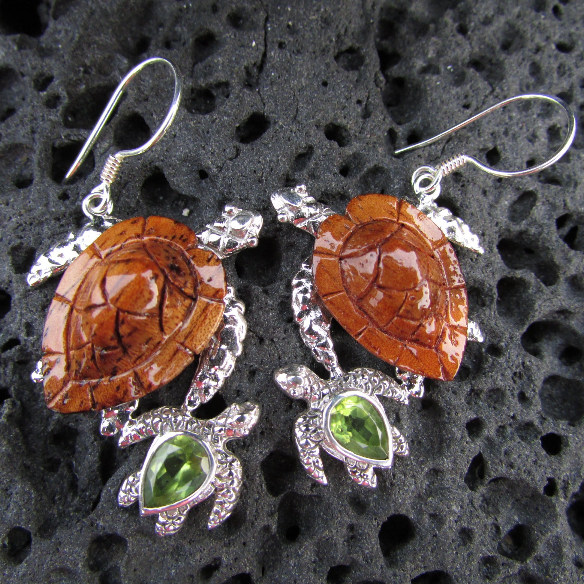Sea Turtle Earrings | Peridot | Hawaiian Koa Wood | Sterling Silver | Ocean | Beach | Gift | Jewelry | Handmade | Unique