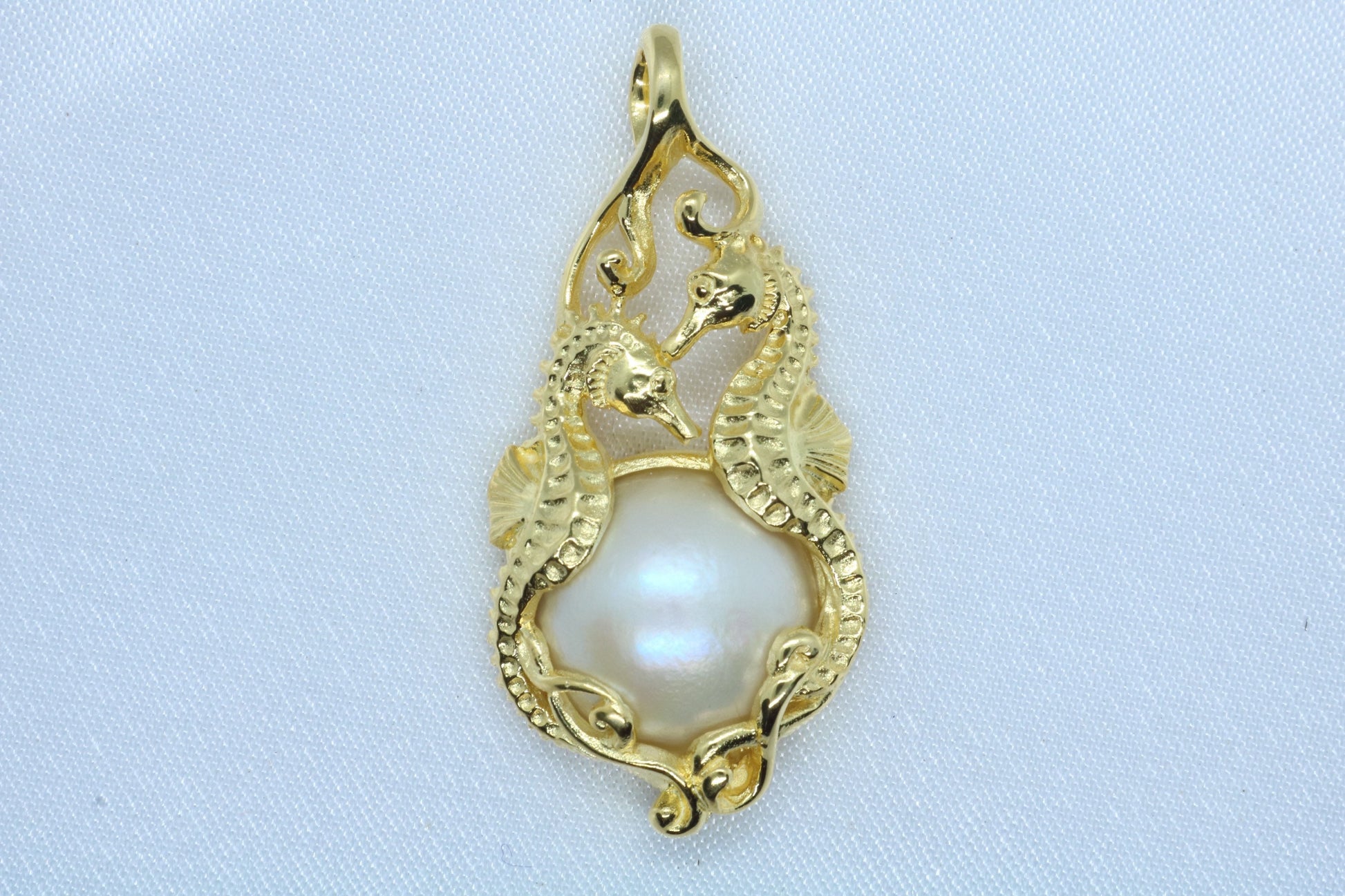 Seahorses 18k Gold Vermeil Mabe White Pearl Pendant Necklace