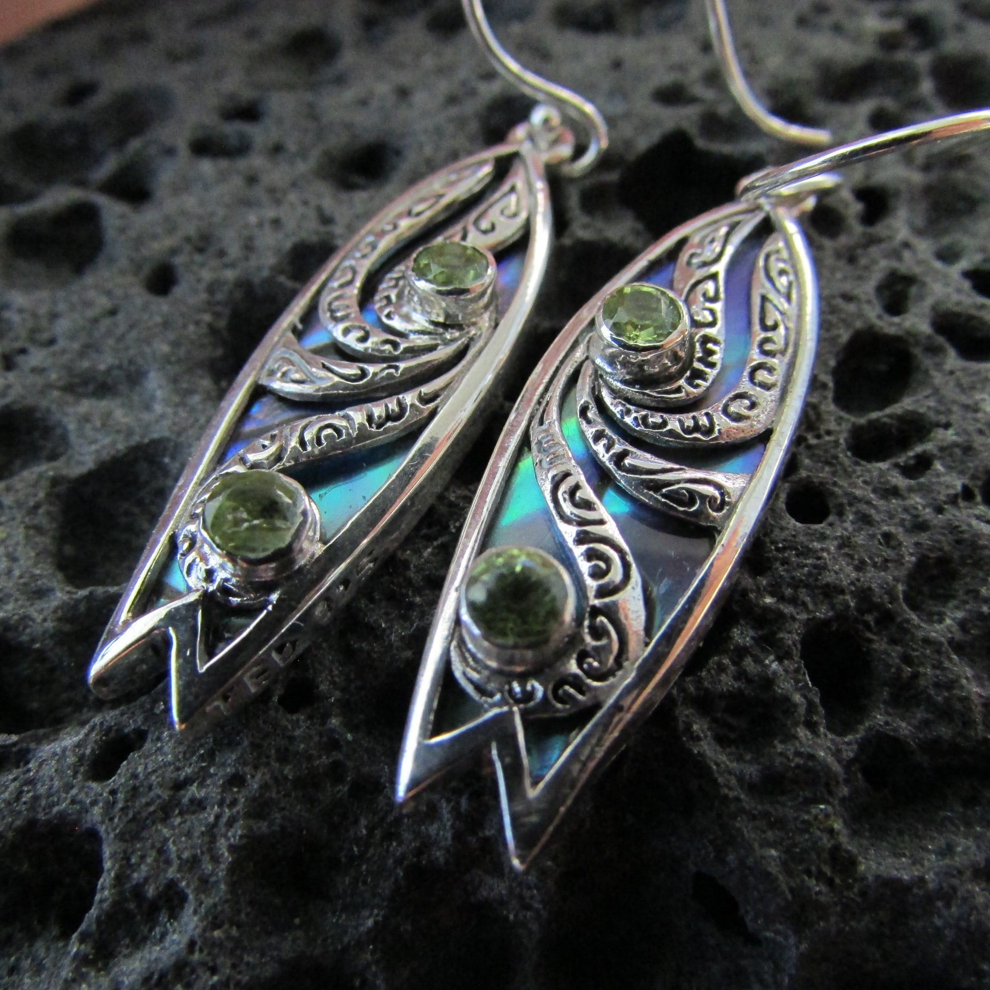 Surfboard Earrings with Polynesian Tattoo Design. Peridot. Abalone Paua Shell. Sterling Silver.