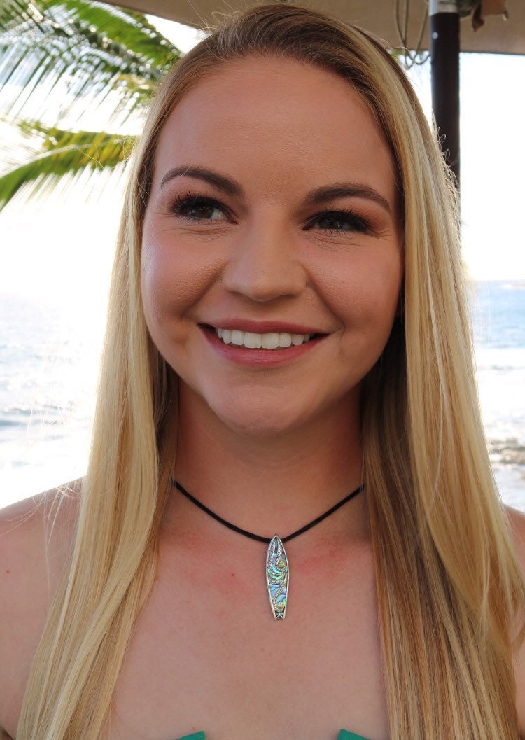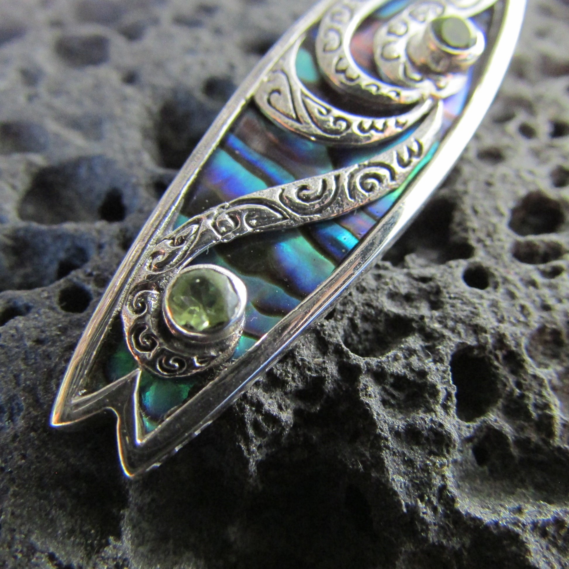 Surfboard Polynesian Tattoo Design. Peridot, Paua Abalone Shell, Sterling Silver.