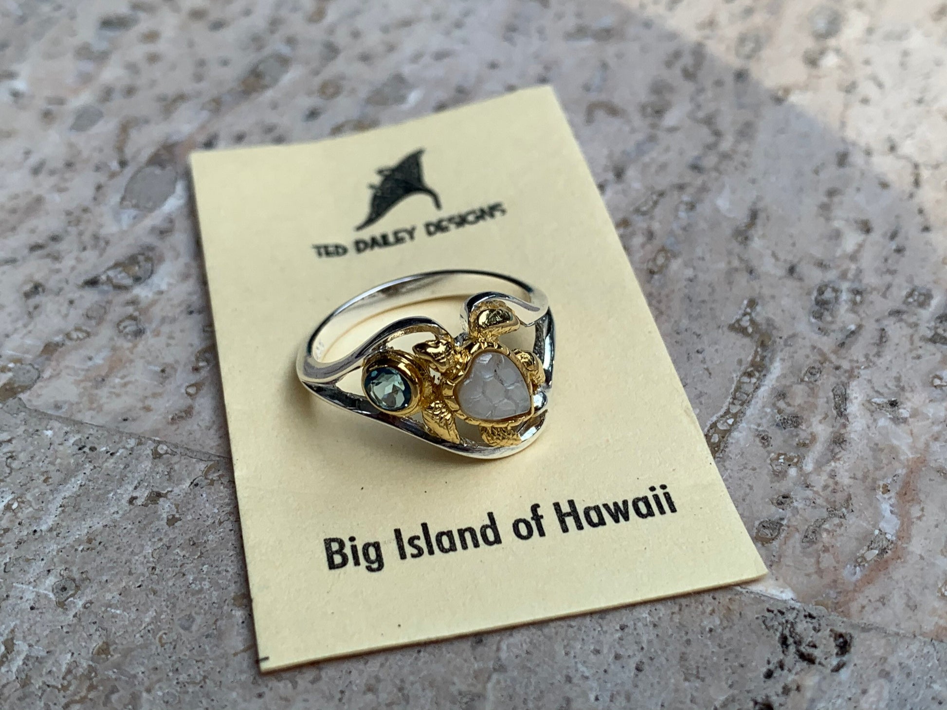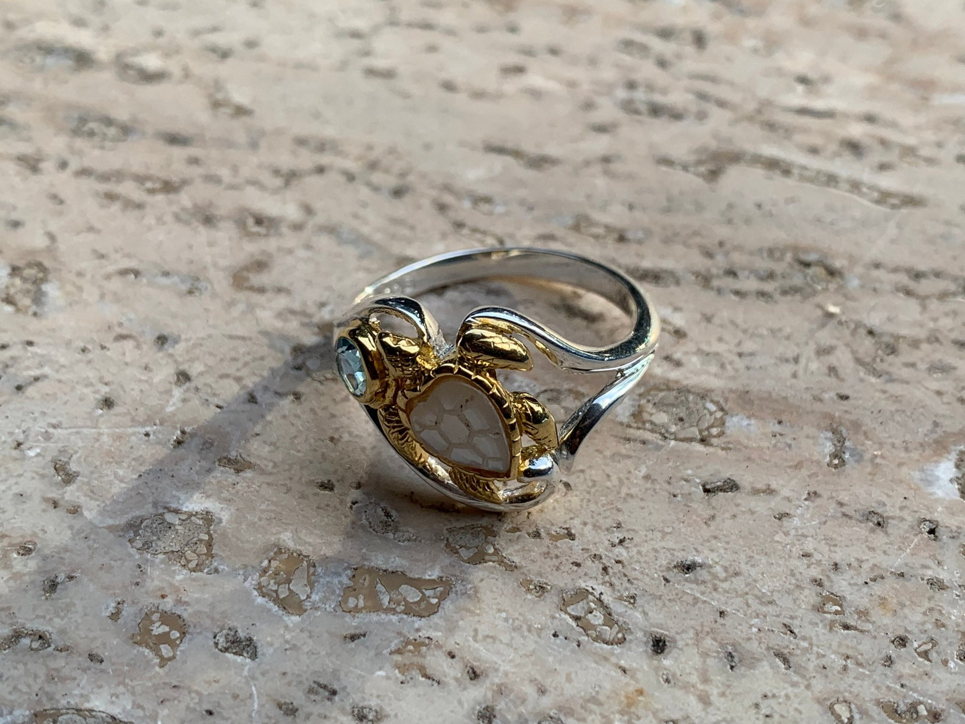 Swiss Topaz Turtle Ring. Mother of Pearl, Silver, Gold.