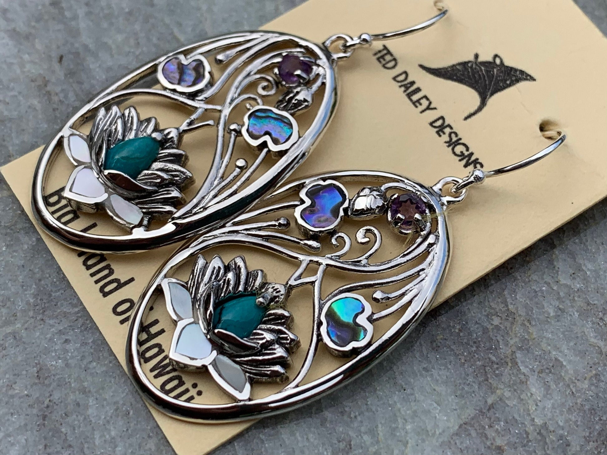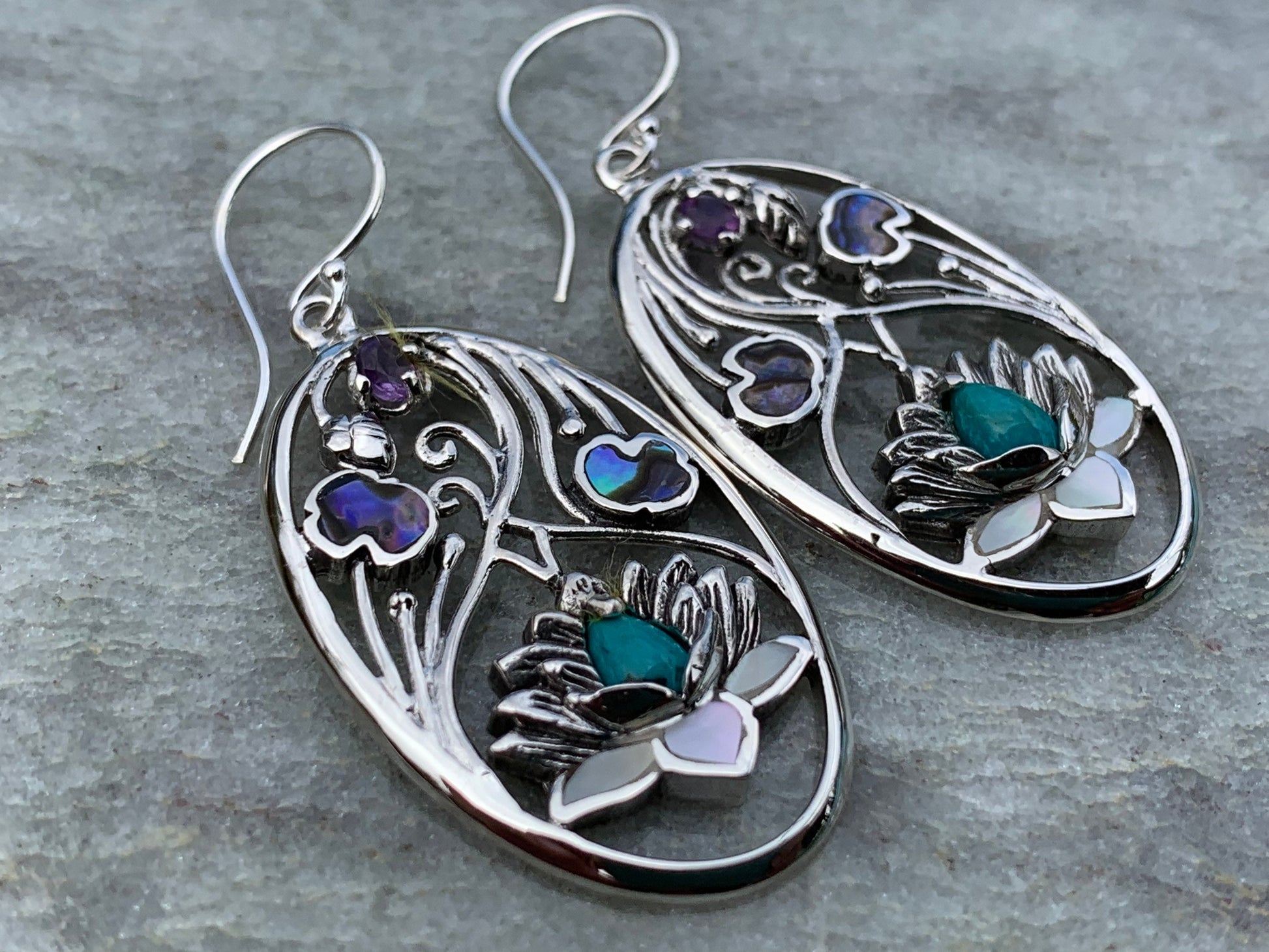 Turquoise Amethyst Lotus Earrings. Sterling Silver. Abalone Shell, Mother of Pearl.