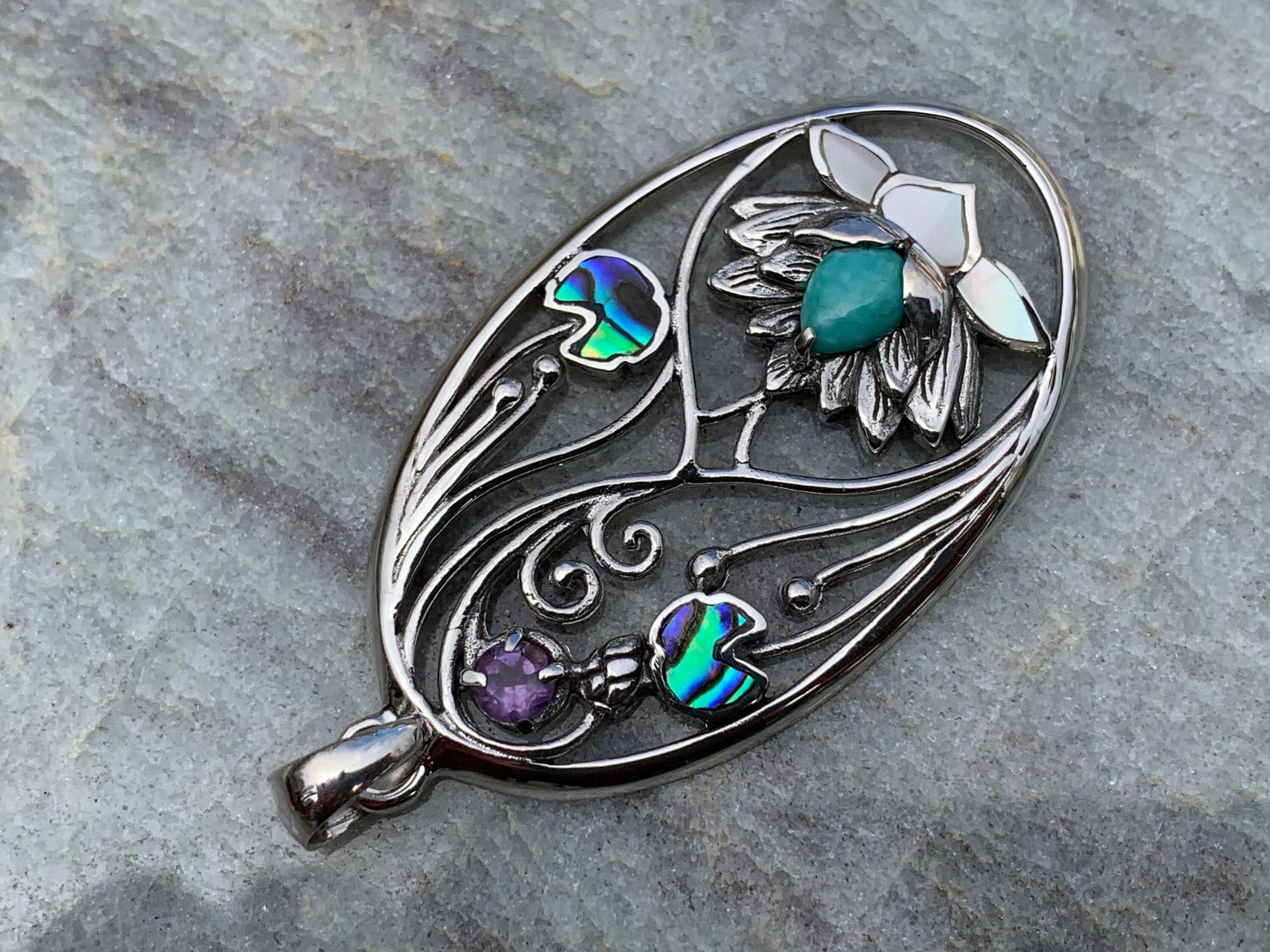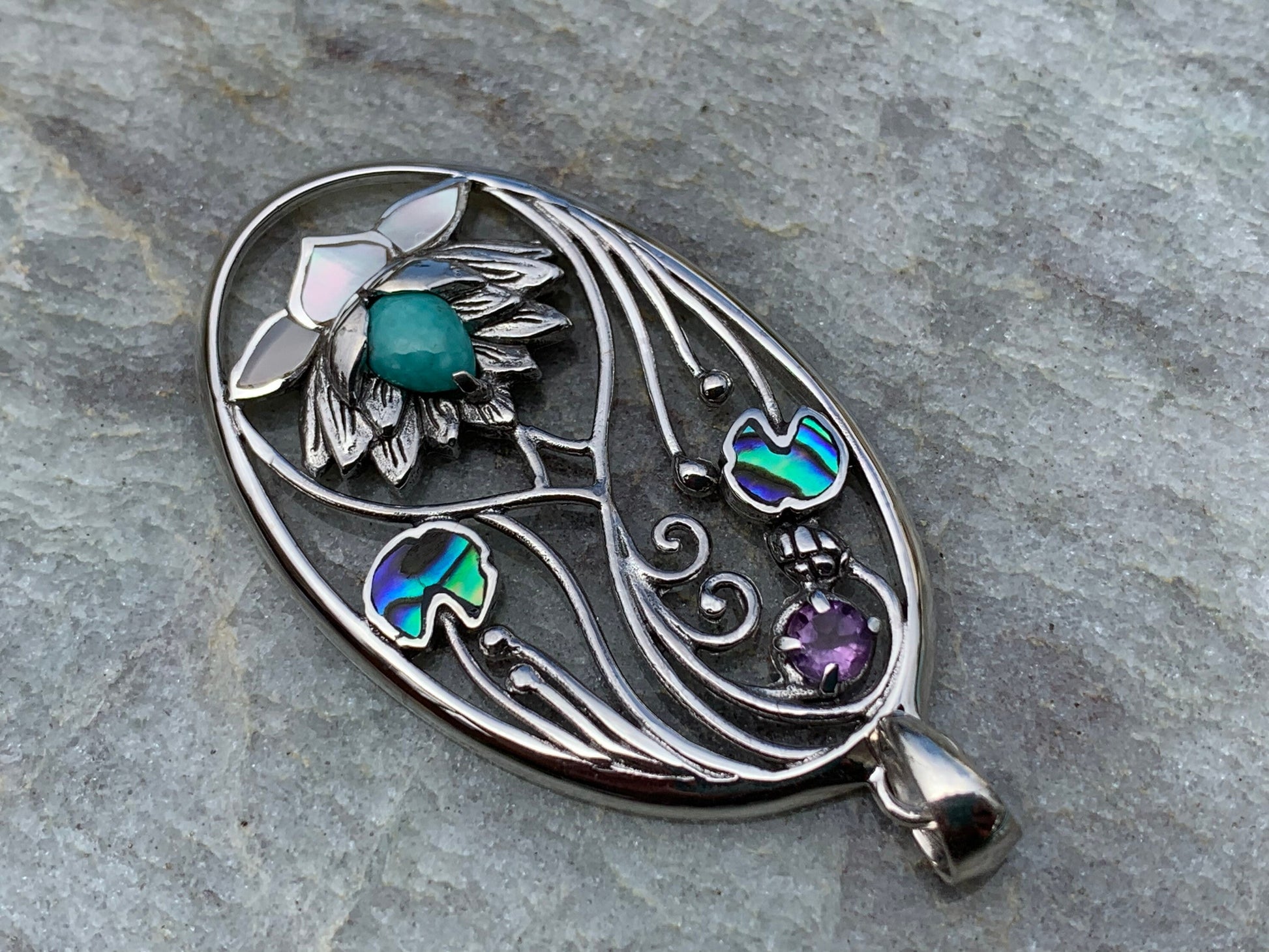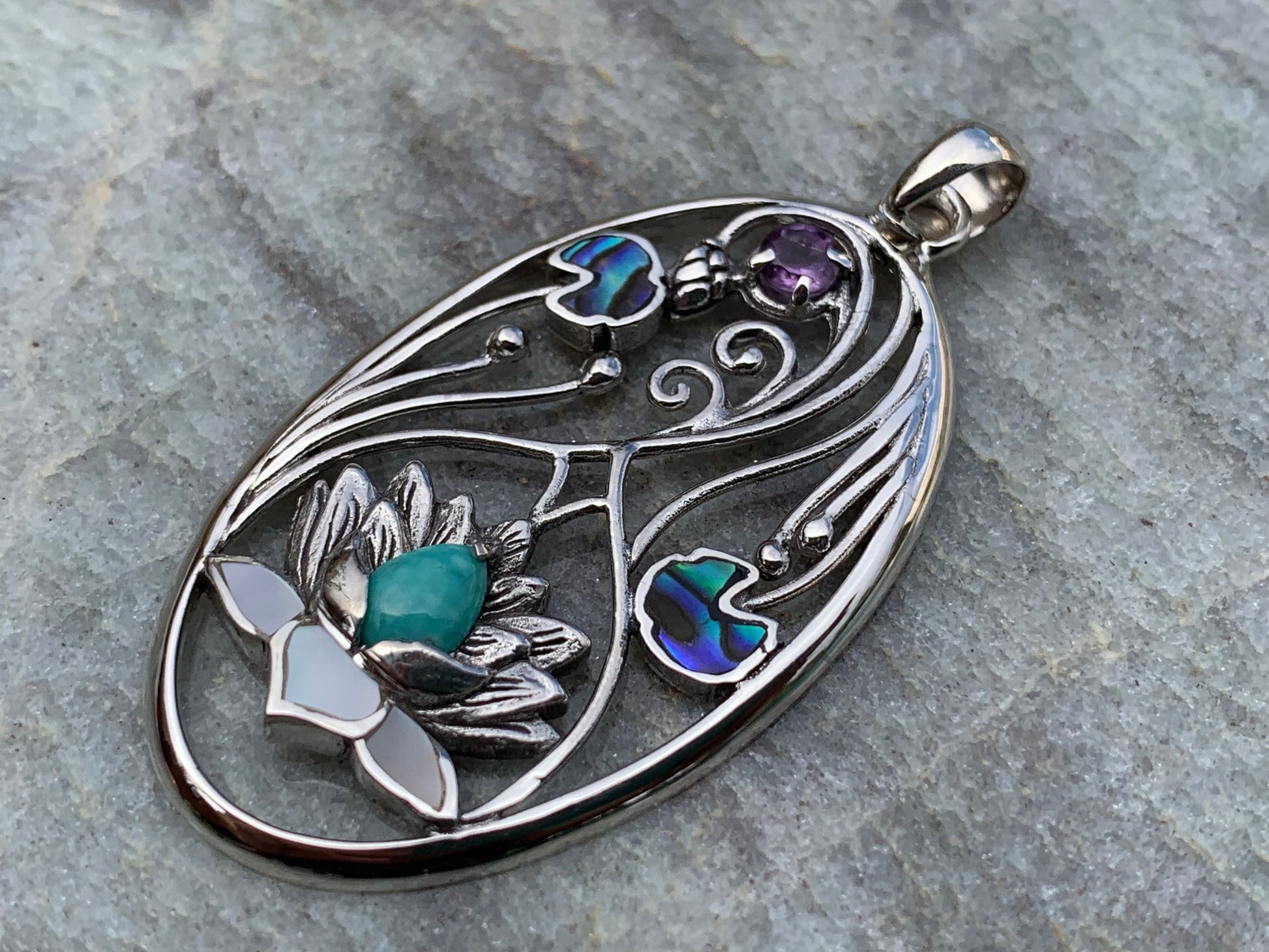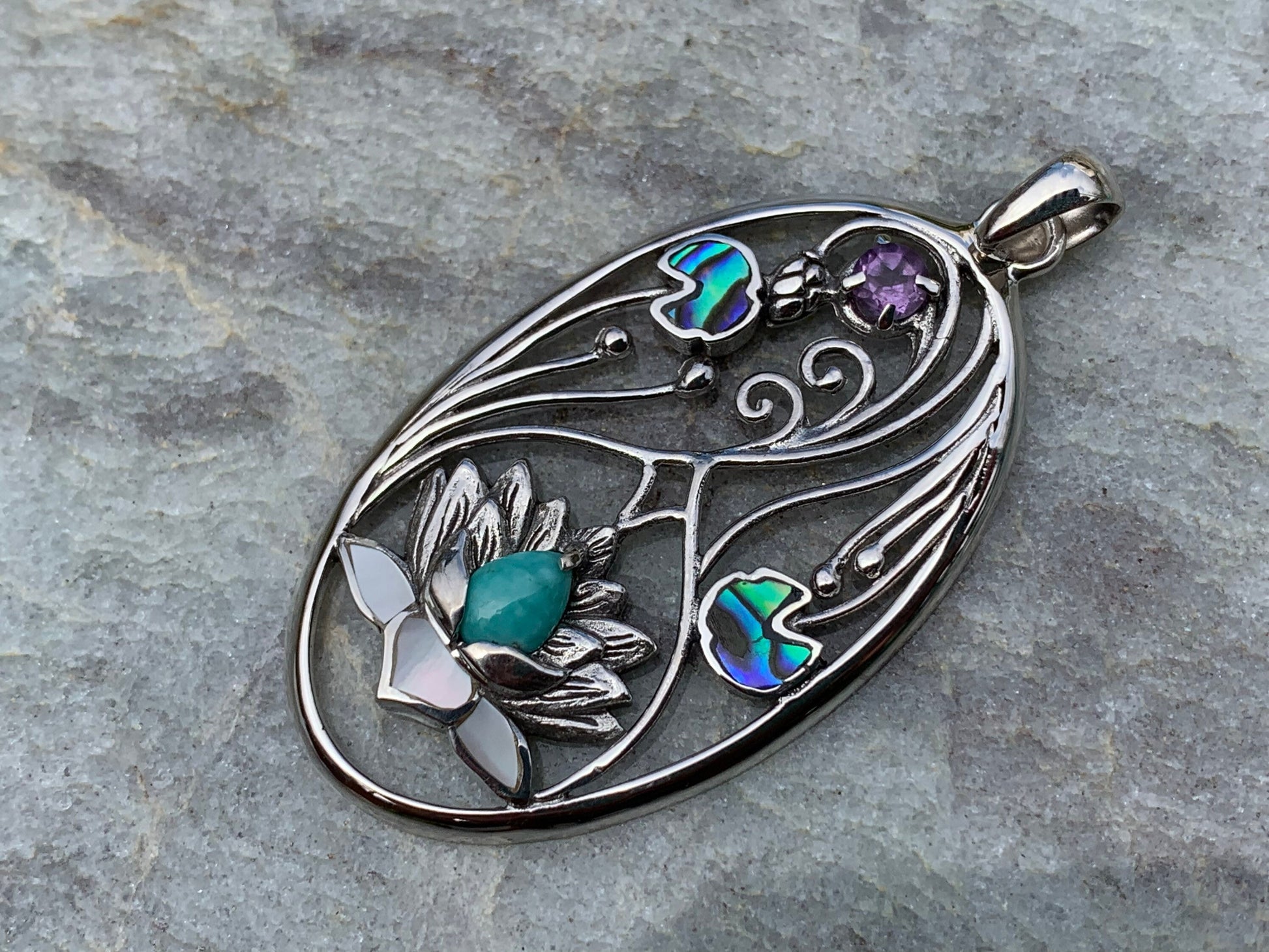 Turquoise Amethyst Lotus Necklace Pendant. Sterling Silver. Abalone Shell, Mother of Pearl.