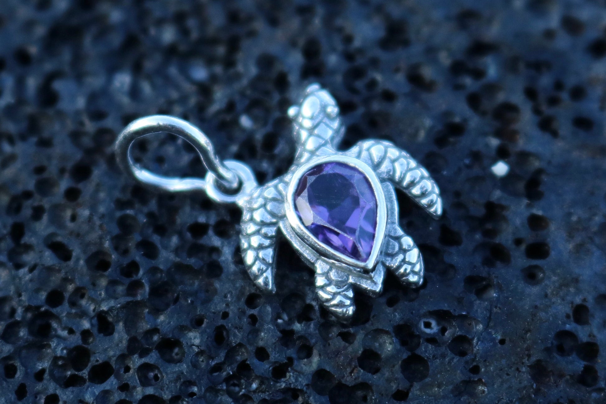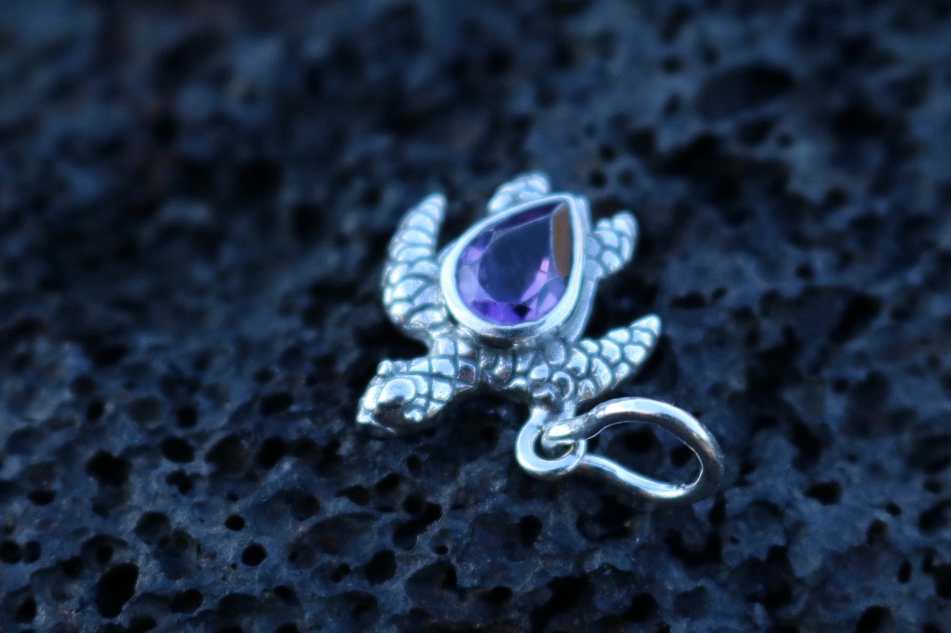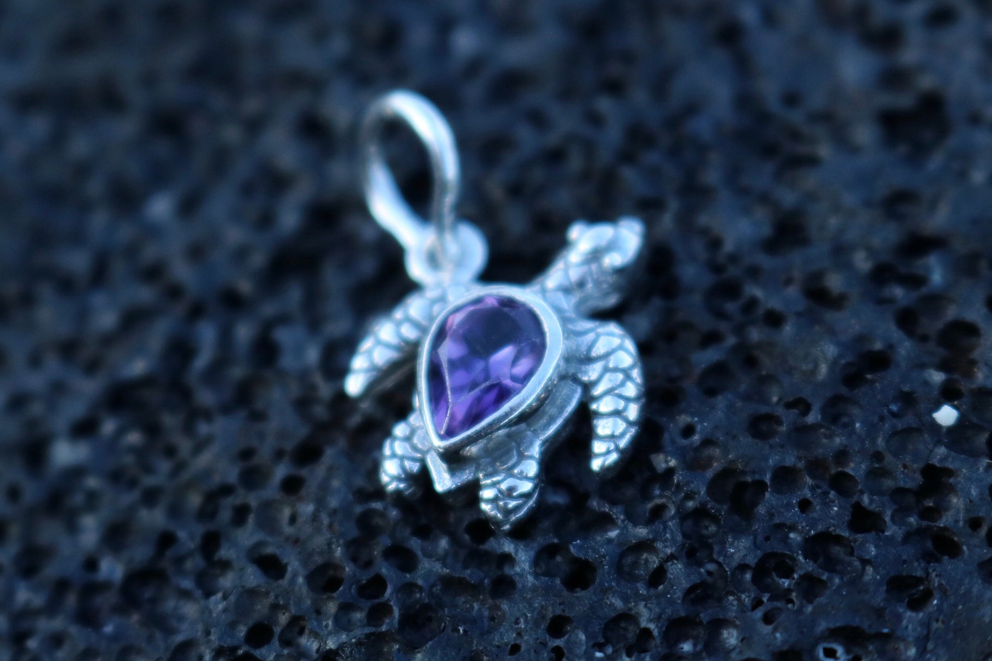 Turtle Charm Amethyst Necklace Pendant. Sterling Silver.