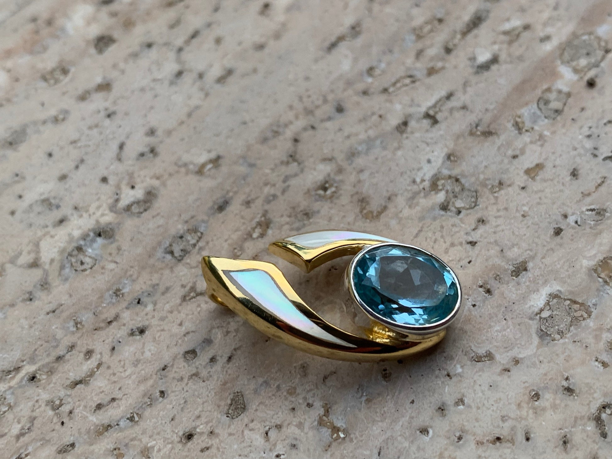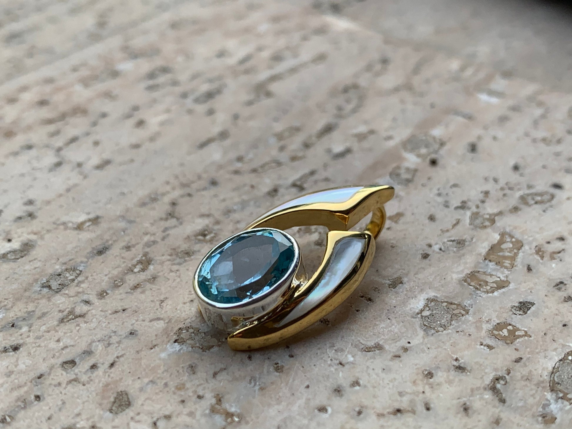 Wave Pendant. Blue Swiss Topaz, Mother of Pearl, Gold Vermeil.